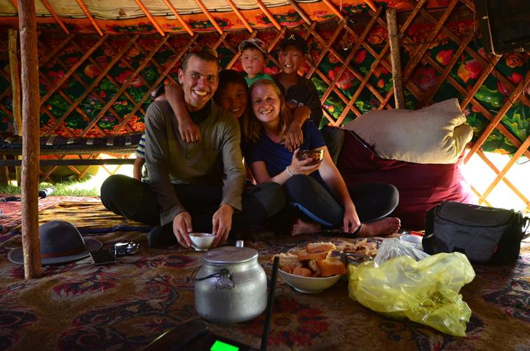 Plavák se lekl a utekl i s nákladem. Rodina, která zde bydlí, nám ho pomáhá zahnat do rohu ohrady, kde mu otec rodiny sváže přední nohy a nauzdí ho. Pak z koně sundají náklad a zvou nás k sobě na návštěvu na chleba, typický mongolský čaj s mlékem a sušený sýr. Mongolský čaj má specifickou chuť – je lehce osolený a pije se s mlékem. Docela jsem si na něj zvykla, a když nám ho v některých rodinách nabízejí, přijde mi k chuti.