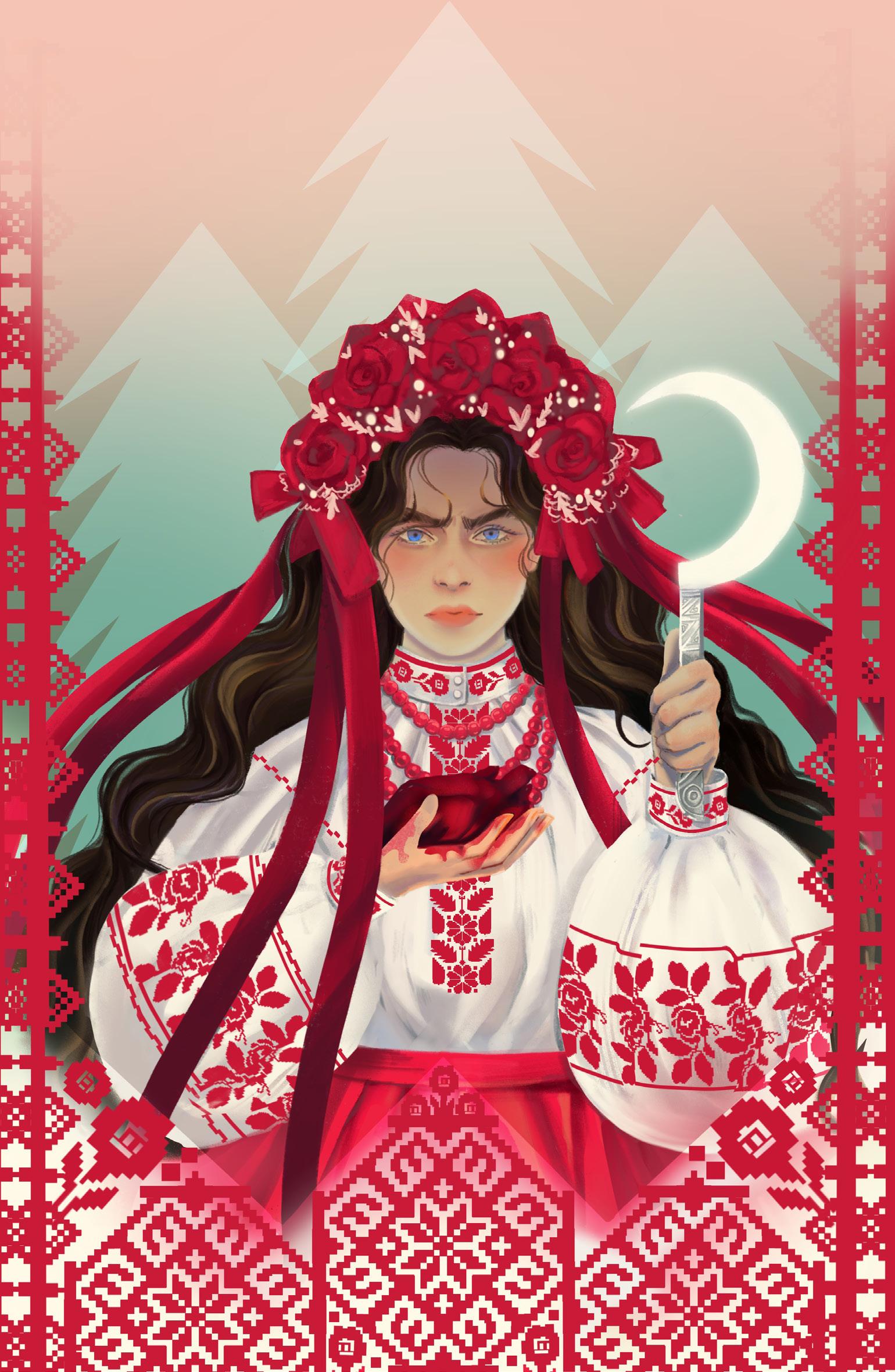 náhrdelník z rudých korálků. Ruzha přemýšlela, jak někdo může mít tak perfektní tváře, tak oslnivé oči, tak dokonale tvarovaná ústa, tak bezchybnou pokožku. Čarodějnice se pousmála, jako kdyby Ruzhe snad četla myšlenky, a mimoděk si urovnala zvonový rukáv svých šatů. Rudá sukně dopadala až na podlahu, světlý živůtek a ramena zkrášlovala bohatá výšivka červenou nití.
