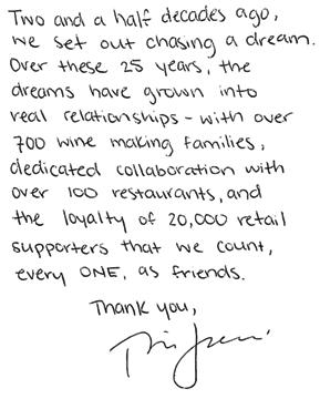 Twenty-five years in any industry is an amazing feat. Our success is rooted in a team of dedicated wine nerds and professionals who care about this place, what we stand for, and the relationships we have built on all sides of the business. However, none of this would be possible without the vision and dedication of our founder and President, Tina Jones.