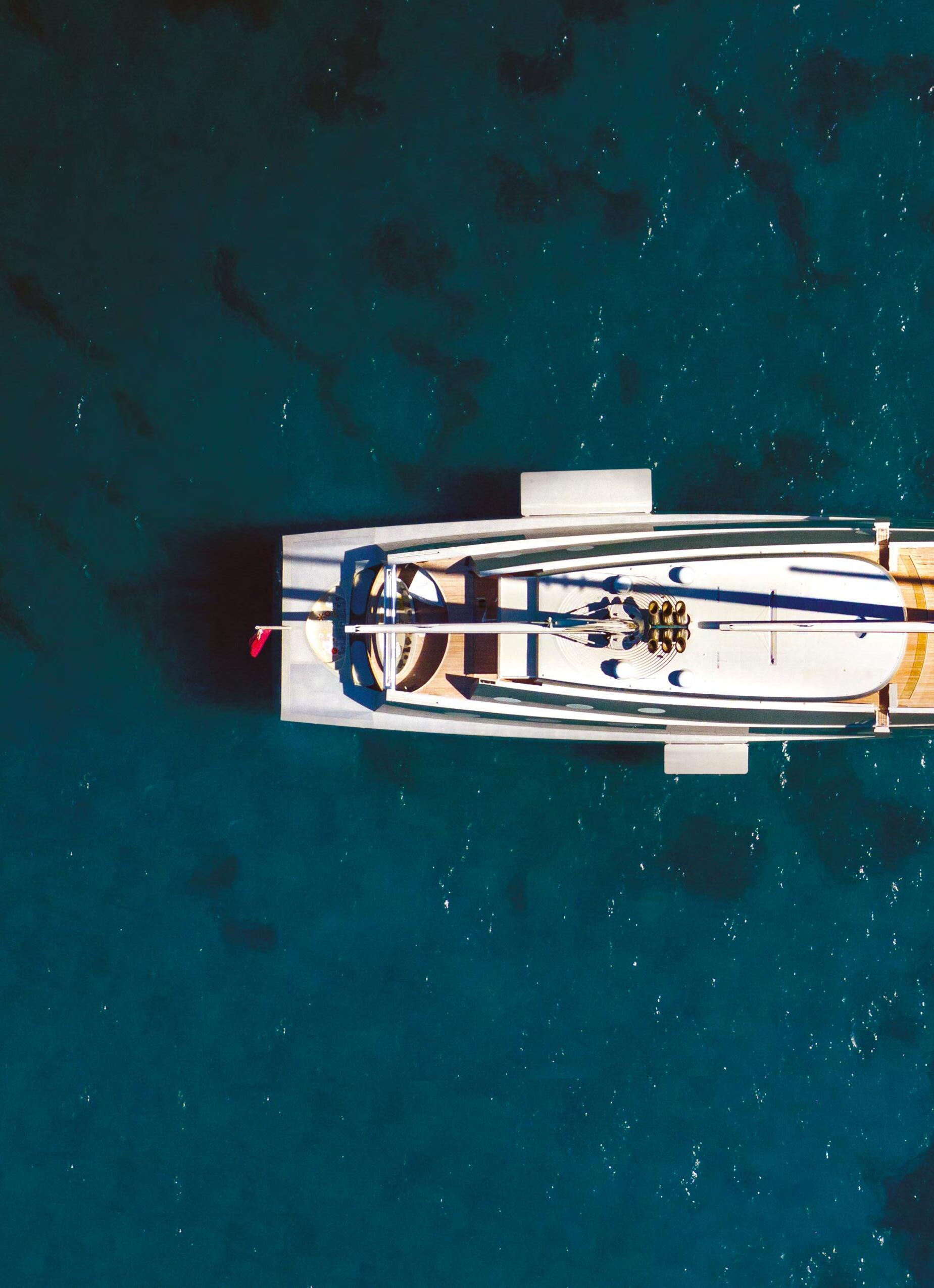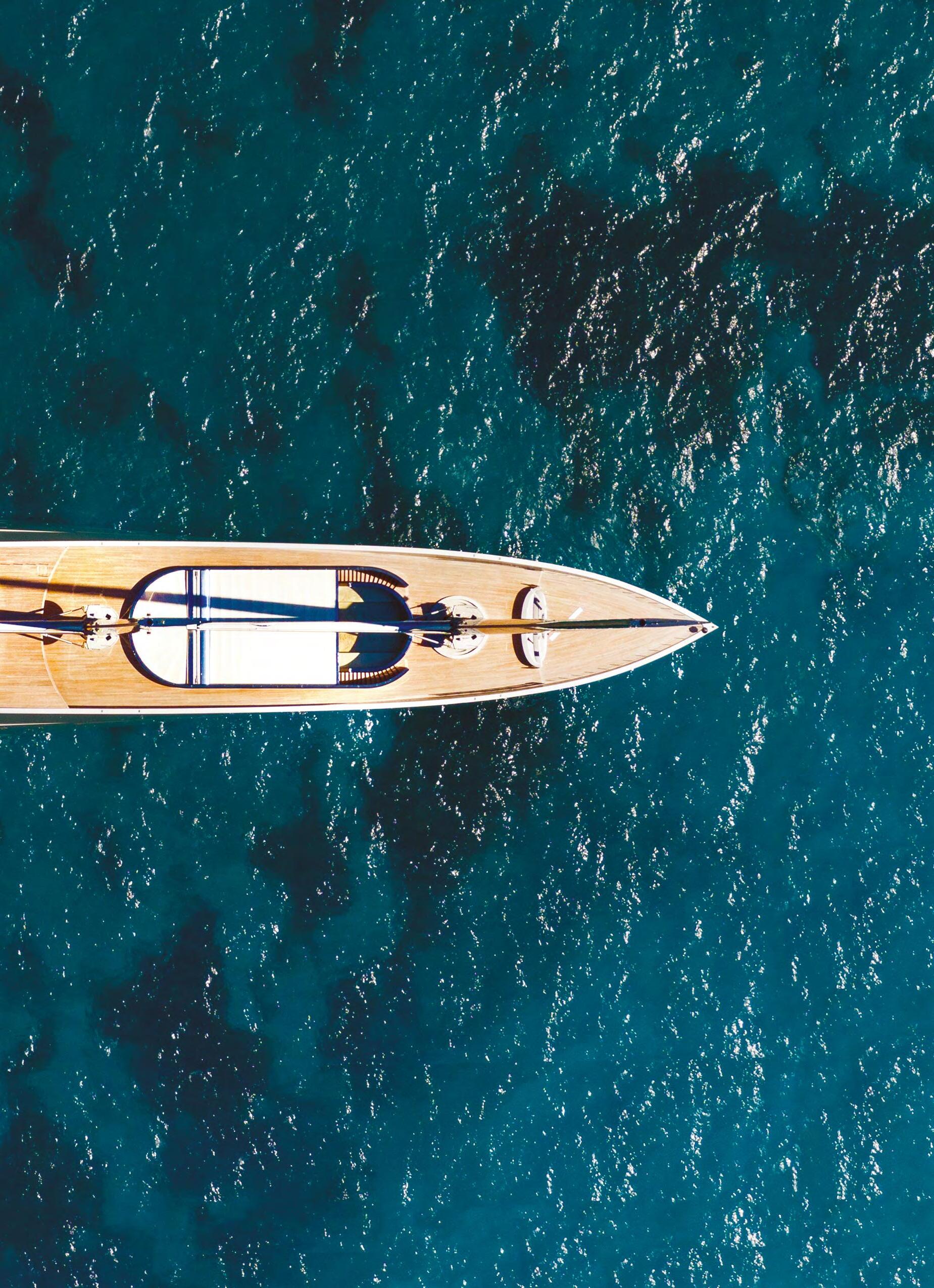 From the air — his signature vantage point — St. Barths dissolves into a geometry of purity: long strokes of turquoise, yacht wakes etched into clean white lines, and shadows drifting lightly across curves of sand. His lens captures not movement itself, but the memory of movement.
