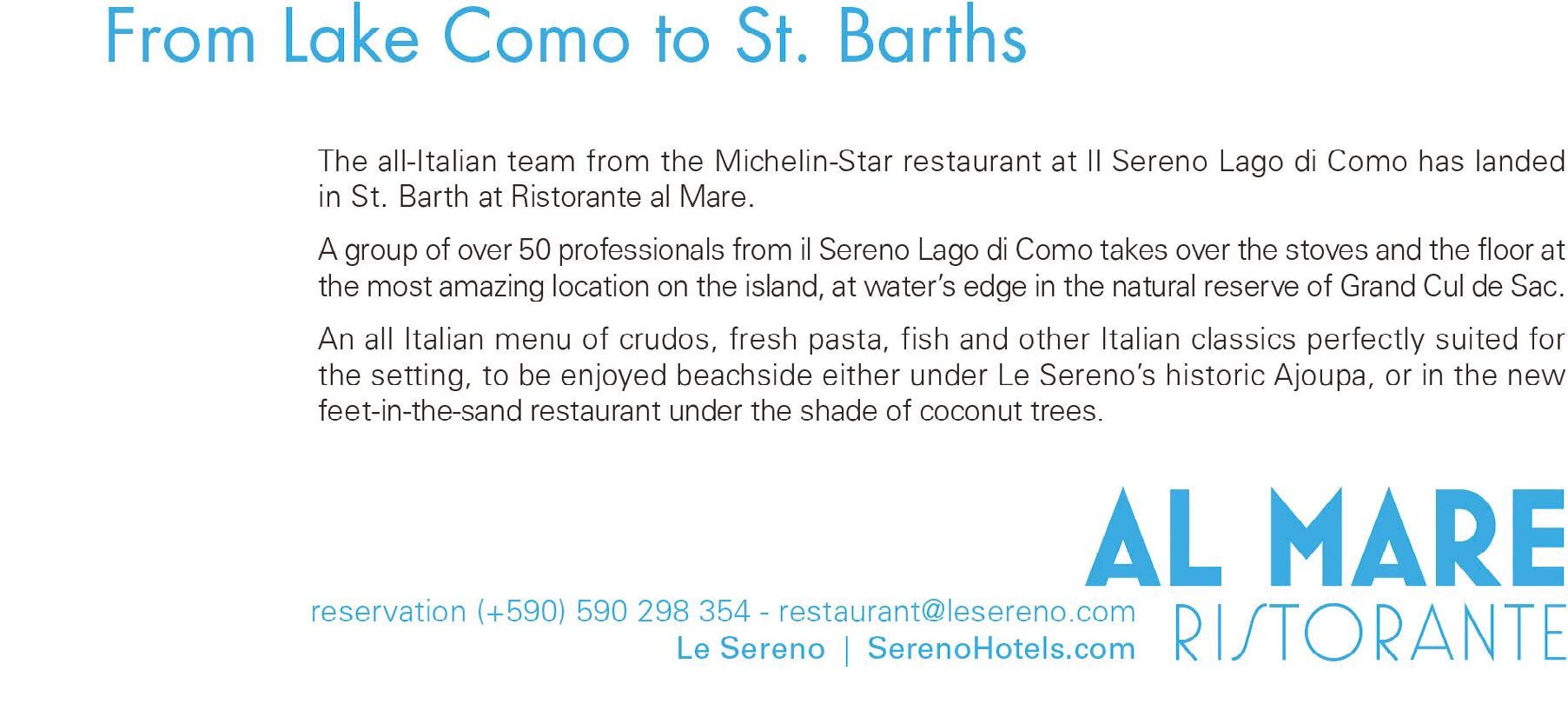 Indulge in a culinary journey at Al Mare restaurant, where the Michelin-starred Italian kitchen from our sister property, il Sereno in Lake Como, Italy, takes center stage. Make your reservations for Monday evening to enjoy the harmonious tunes of live musicians, adding a touch of enchantment to your dining experience. Join us for a memorable dining experience where the flavors of Italy meet the beauty of St Barths.