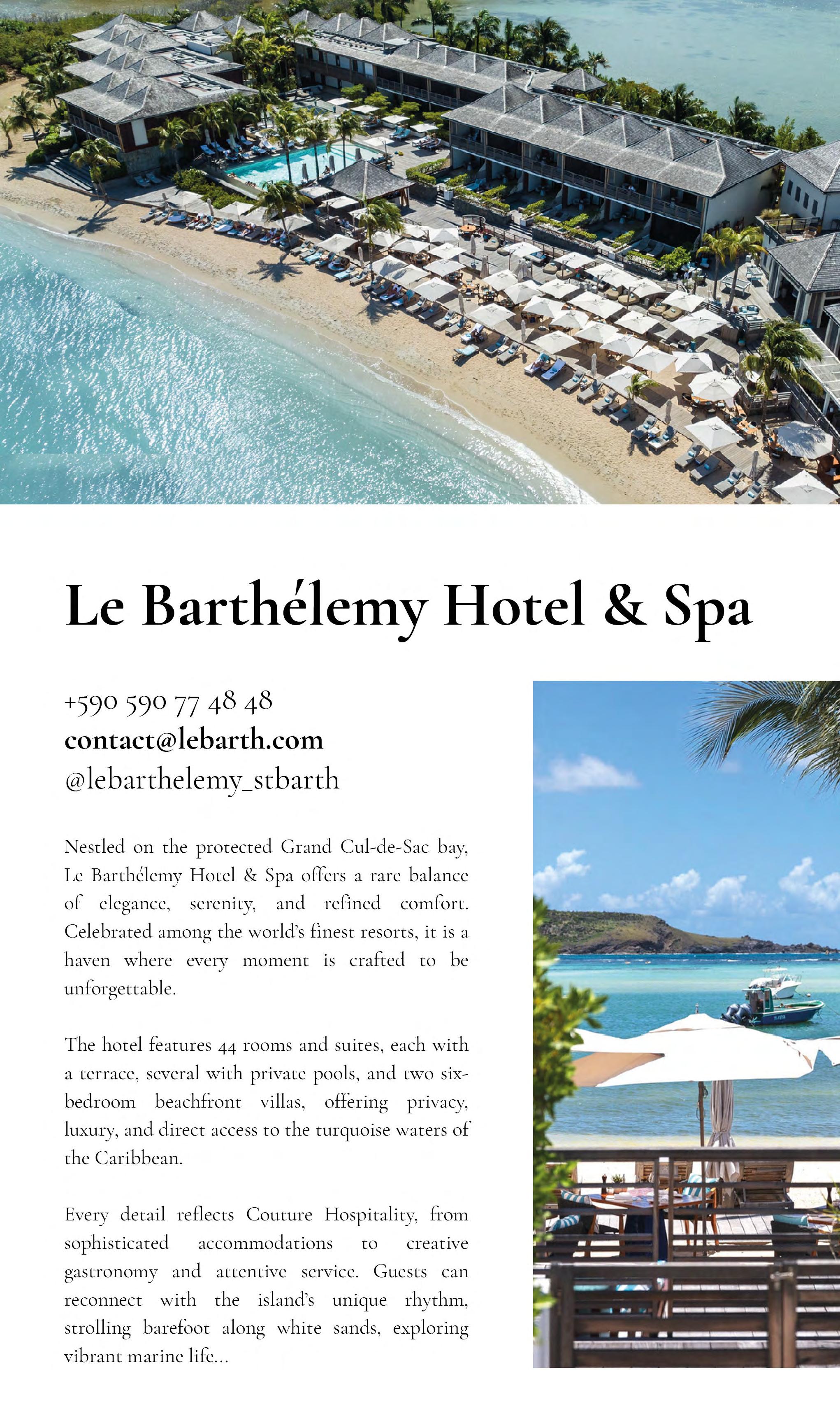 Perched above the harbor of Gustavia, Fouquet’s Saint-Barth , part of the prestigious Barrière Group, embodies the perfect balance of French art de vivre and island serenity. Reimagined in 2020 after an extensive renovation, this intimate five-star property offers just 16 suites and one exclusive villa, each with a private plunge pool and sweeping Caribbean views. Surrounded by tropical gardens yet steps from Gustavia’s boutiques and nightlife, the hotel also features Beefbar, Shellona Beach Club, and the Spa Diane Barrière in partnership with Biologique Recherche a haven of well-being where sophistication and relaxation meet under the St Barths sun.