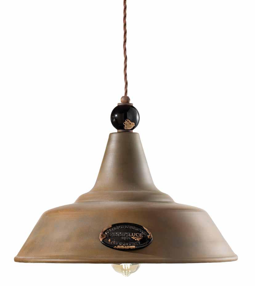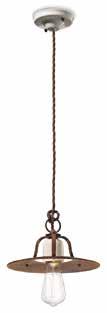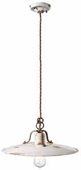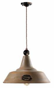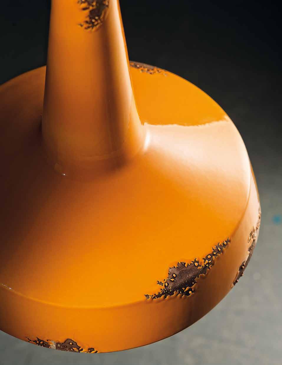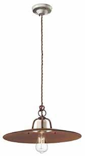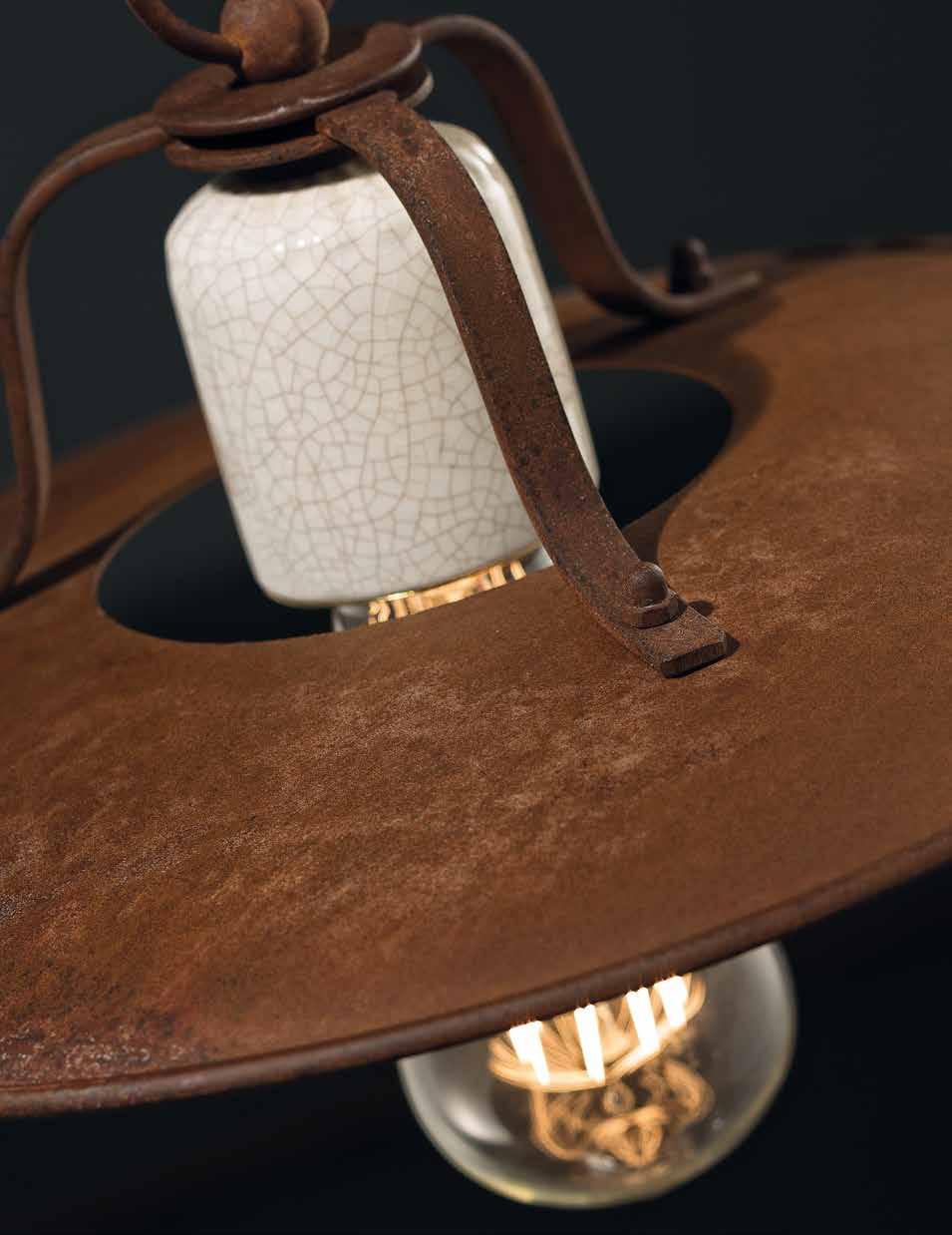 OPAQUE RUSTY METAL AND CRAQUELÈ DETAILS COMPLETE THE BALANCE BETWEEN FULL AND EMPTY SHAPES. THE AMPLE CROWN AND RISE AND FALL SYSTEM MAKE IT POSSIBLE TO ADJUST THE BRIGHTNESS WITHIN A COUNTRYLIKE ENVIRONMENT.