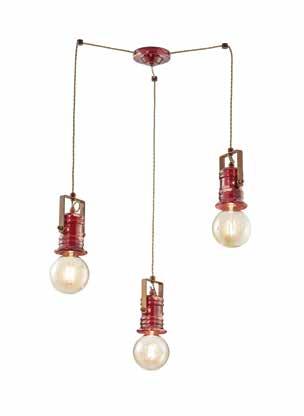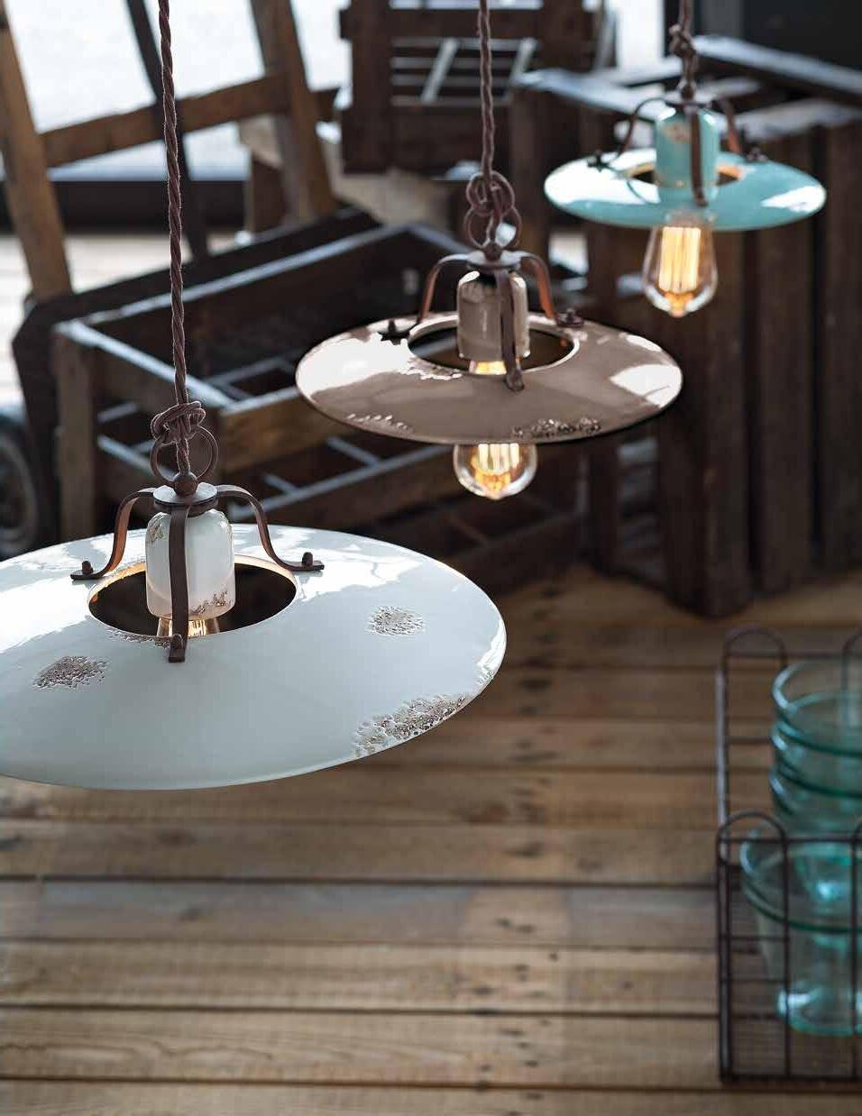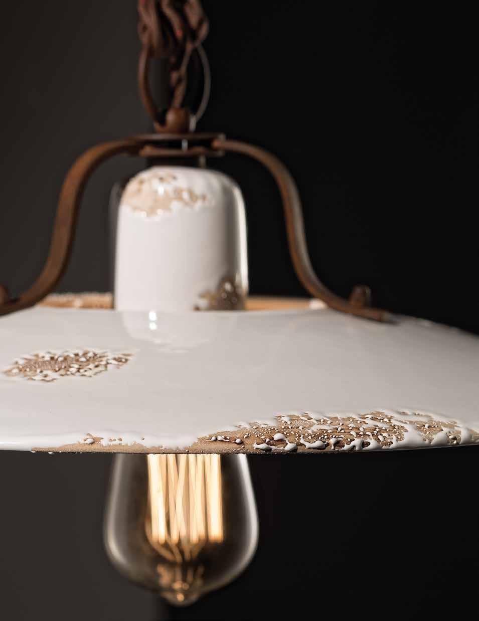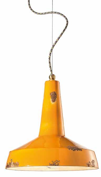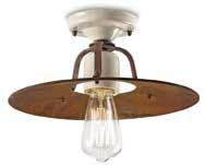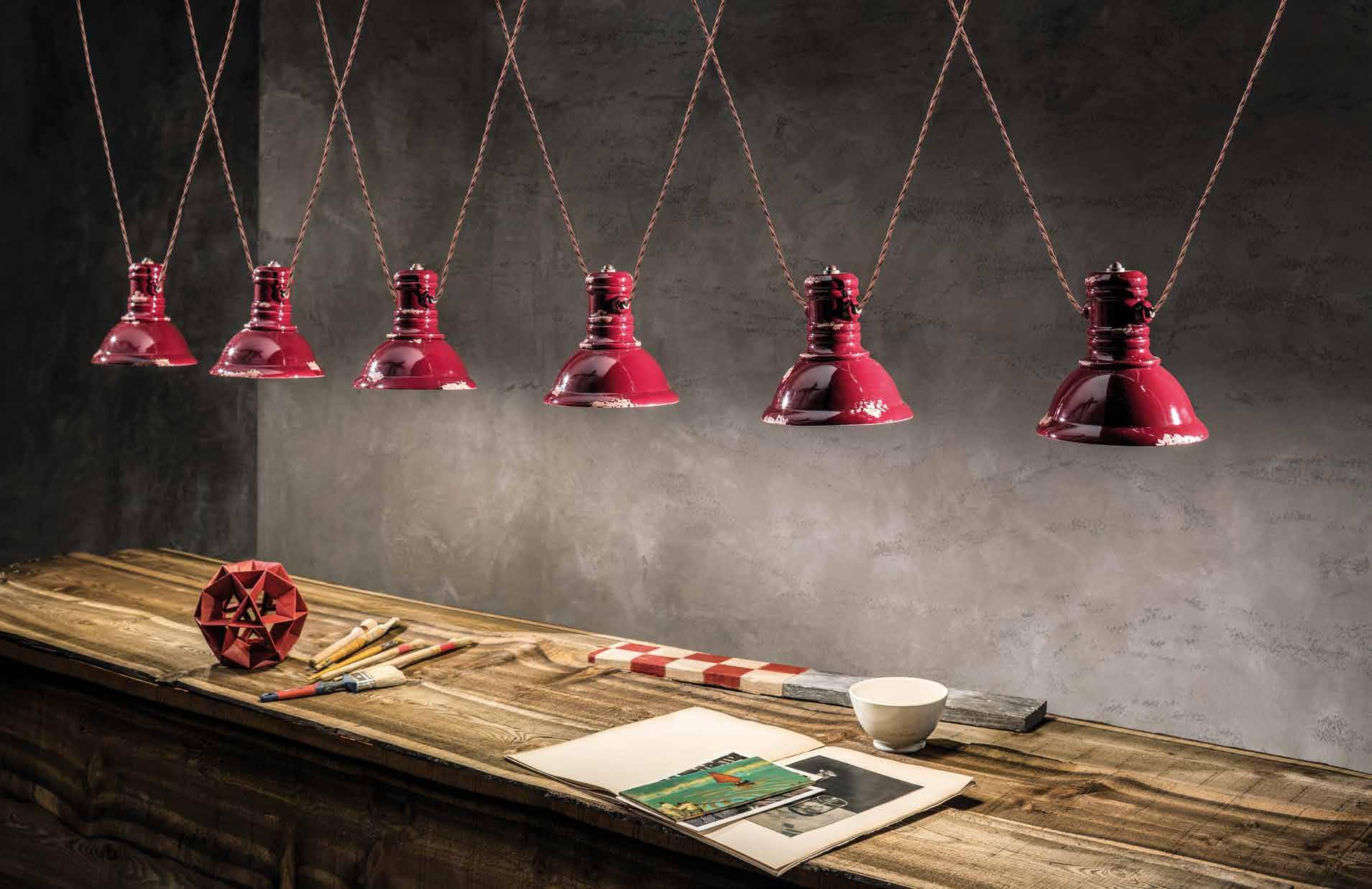 OPAQUE RUSTY METAL AND CRAQUELÈ DETAILS COMPLETE THE BALANCE BETWEEN FULL AND EMPTY SHAPES. THE AMPLE CROWN AND RISE AND FALL SYSTEM MAKE IT POSSIBLE TO ADJUST THE BRIGHTNESS WITHIN A COUNTRYLIKE ENVIRONMENT.