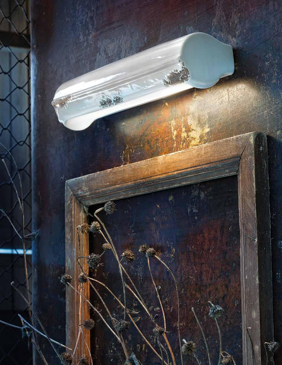 UNA FORMA SEMPLICE E UNA VEROSIMILE RIPRODUZIONE DELL’EROSIONE DEL TEMPO, ABBINATE ALL’IMPIEGO DI SUPERFICI LUCIDE, DANNO QUEL VALORE IN PIÙ ALL’APPLIQUE, RENDENDOLA PERFETTA PER ILLUMINARE QUADRI E SPECCHI VINTAGE.