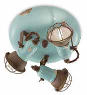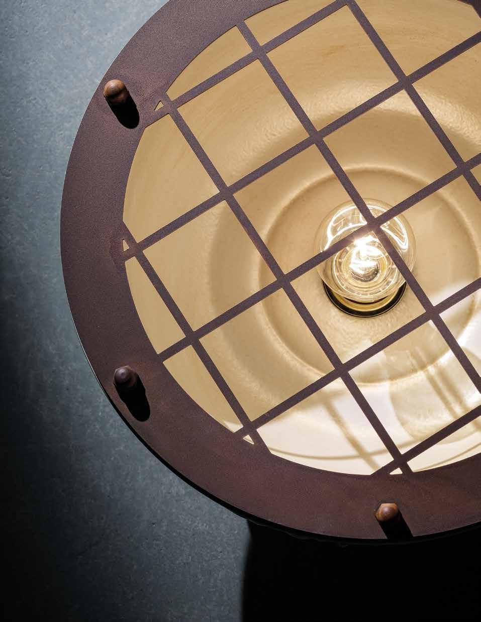 I DETTAGLI, COME IL COPERCHIO A GRIGLIA E I DADI CIECHI DI FISSAGGIO IN FINITURA CORTEN, RENDONO INIMITABILE LA PLAFONIERA DALLO STILE NAUTICO.