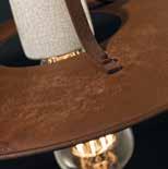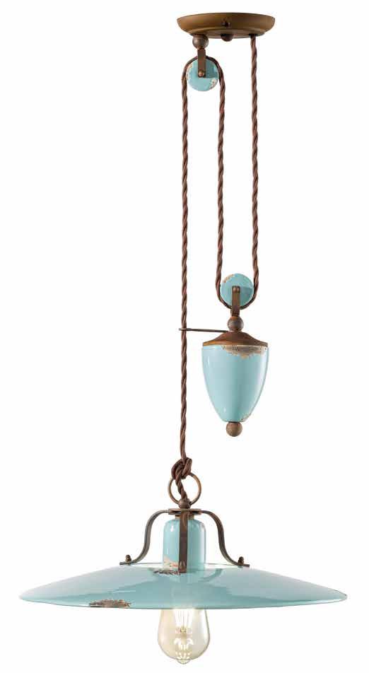 METALLO RUGGINE OPACO E DETTAGLI CRAQUELÉ CONFERISCONO UN EQUILIBRIO DI PIENI E VUOTI. LA CORONA AMPIA E IL CAVO INTRECCIATO CON CONTRAPPESO CONSENTONO DI REGOLARE LA LUMINOSITÀ DI UN AMBIENTE DAL SAPORE COUNTRY.