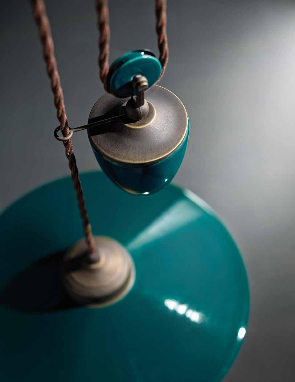 THE COLOURED CERAMICS FIT WELL WITH THE ANTIQUE BRASS AND CONSTITUTE THE ASSETS OF THIS COLLECTION. THE BROAD LIGHT CREATES A WARM AND COZY ATMOSPHERE WHEREVER THEY ARE INSTALLED.