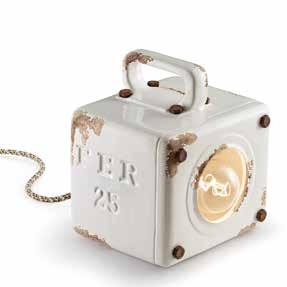 LA GRIGLIA IN METALLO PER PROTEGGERE IL CORPO ILLUMINANTE RENDE LA LAMPADA IN CERAMICA ANTICATA IDEALE PER GIARDINI D’INVERNO O LOCALI CHE EVOCANO LE SERRE DEI PRIMI NOVECENTO.