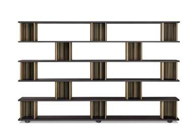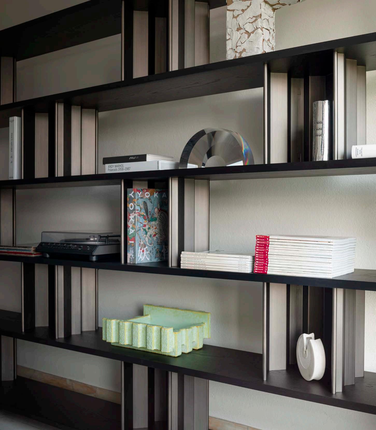 The Plomis bookshelf is a symbol of Italian luxury and elegance. Inspired by flowers, the playful and surprising design adds sophistication to any space. Versatile, Plomis masterfully explores the friction and harmony between minimalist elegance and ornate design. The fragmented surfaces create a stunning interplay of light and shadow, enhancing the contrast between solid metal and the wooden shelfs. Bold and innovative.