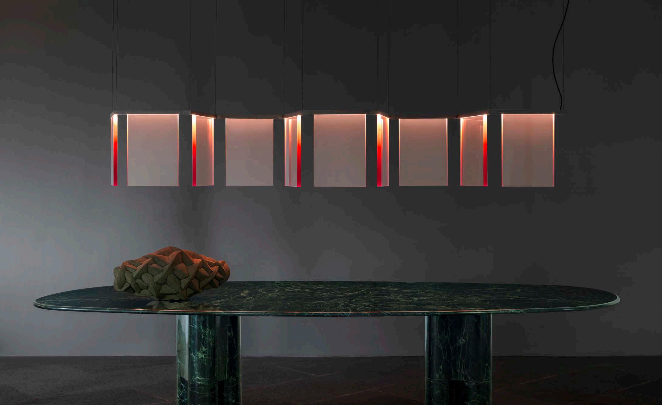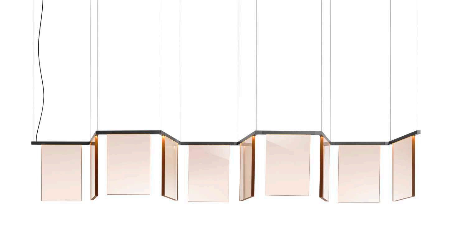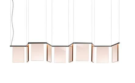 Dash is a light of texture and geometry. Thick, fume’-colored cast acrylic panels, illuminated along the top edge, suspend from the tubular structure which zig zags its way through its route. The light is filtered through the material making a geometric dappledlight effect. With minimal structure, the light is maximized through the acrylic panels, creating a soft, transparent, and warm glow, with a crispier white light onto surfaces below.