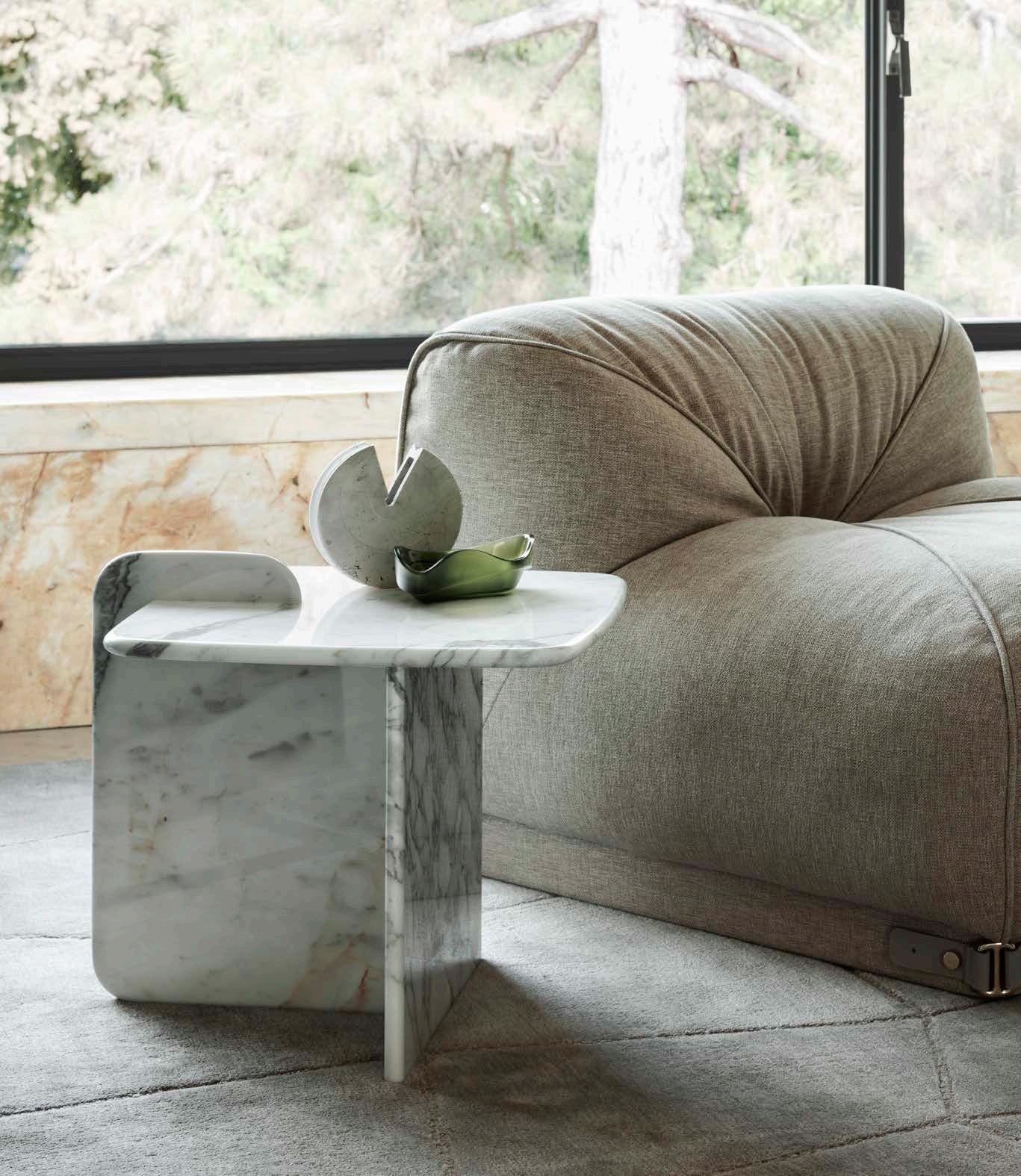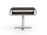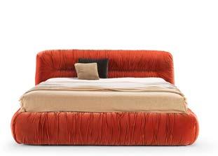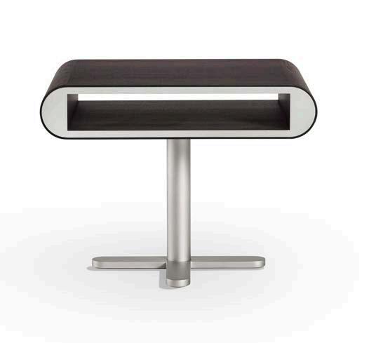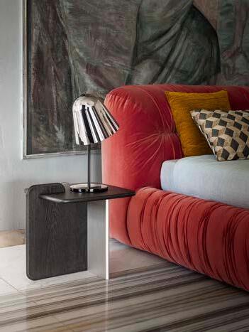 Next to the Mambo bed is a truly elegant combination – soft and enveloping design on one side, and futuristic and clean lines on the other.” The base is formed by a central column that extends into a fourspoke, pedestal-type support, also in a satin platinum finish, the upper structure is a container open on both sides, useful for storing books, objects or small devices.
