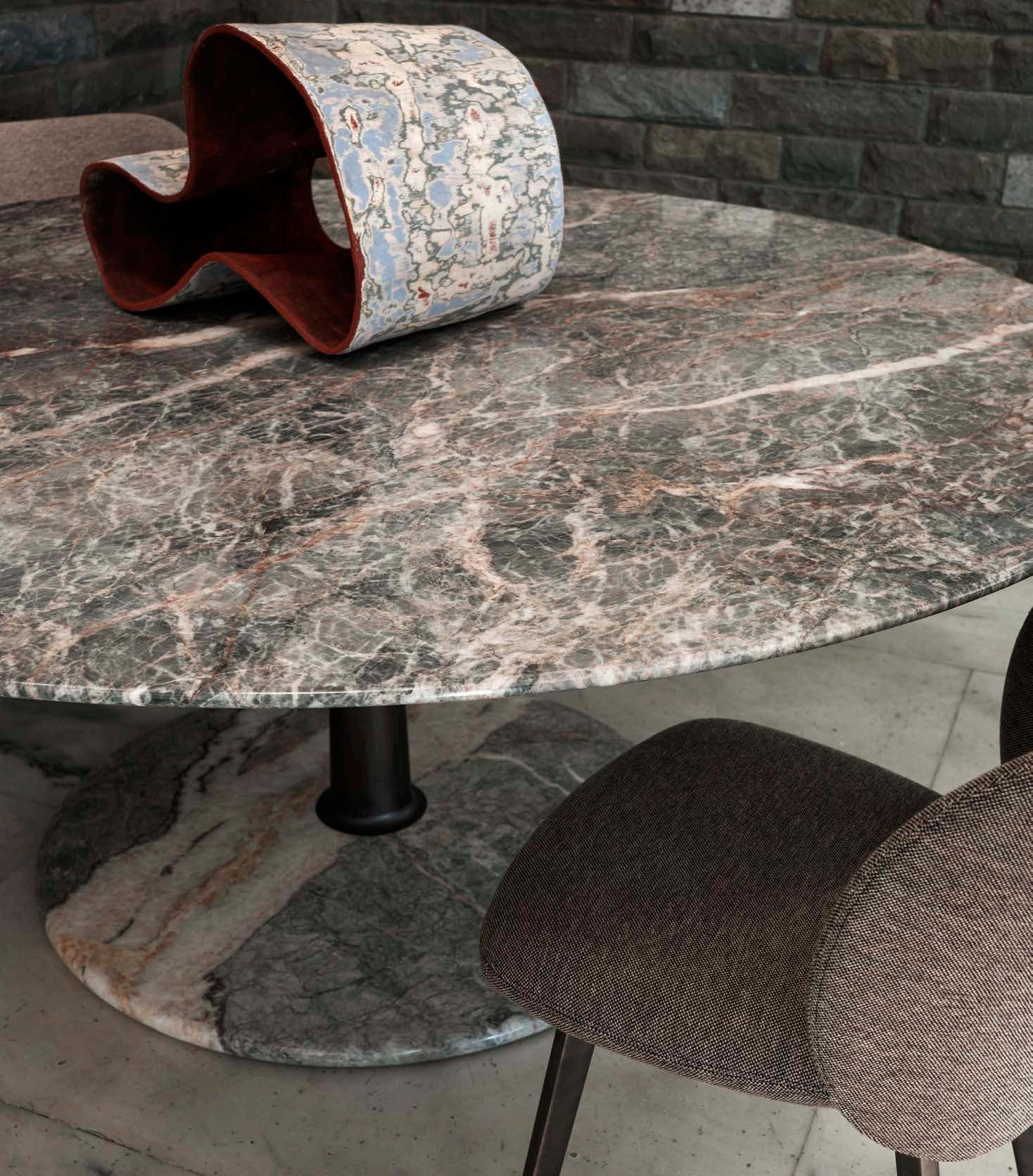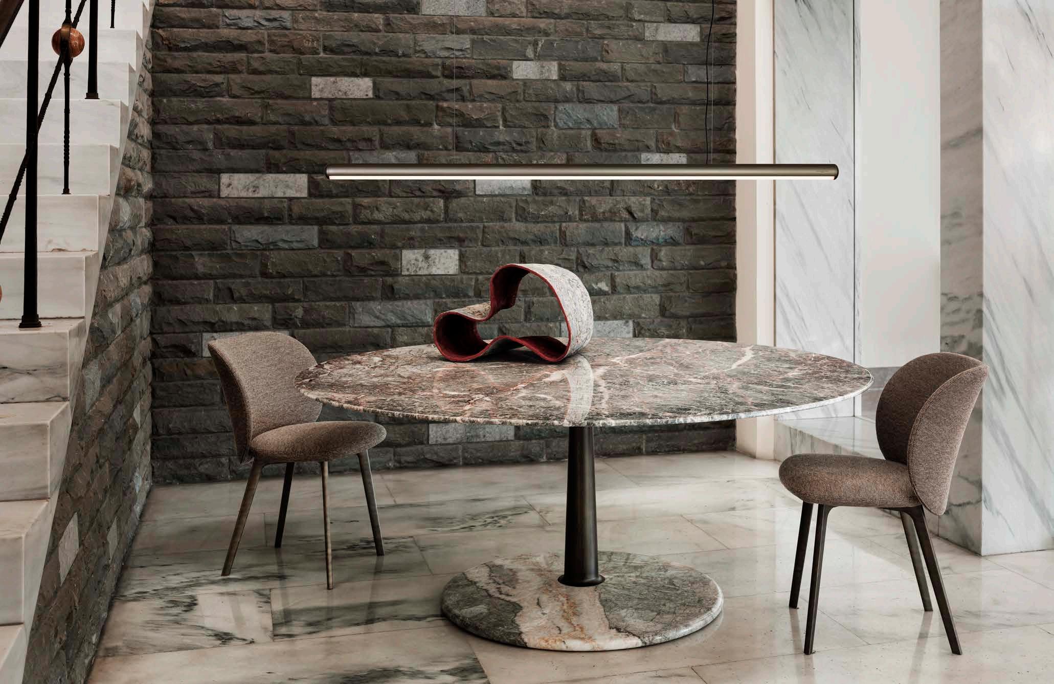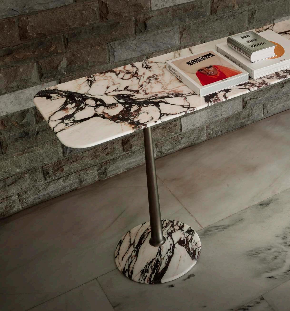 Three geometric shapes (a Line, a Plan, a Volume) and three materials (Metal, Wood, Marble) exploiting the artifice and techniques of “tapering” take the form of asolid tapered column completed with connections at the base and at the head providing a comfortable support surface characterized by a thin rounded edge and a stable truncated cone base. The several combinations of the three geometries and the three materials are enriched by some dimensional variations and, with the study and fine-tuning of their overall proportions, take their definitive and complete form where the elegant aluminum column, which draws and solves the connection and attachment between the top and the base, becomes the distinctive element of the project without taking over the other elements that take part in the compositional game.