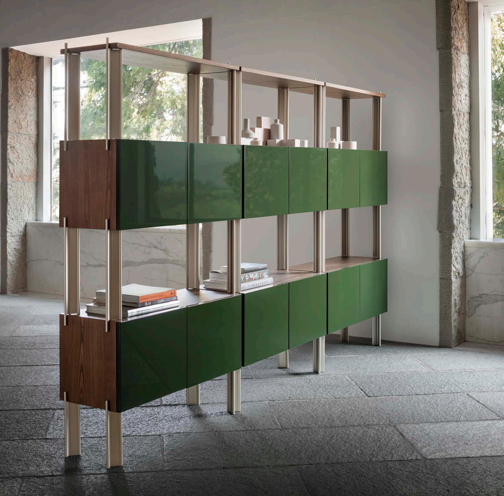The Flexor shelving system’s aluminum extrusion structure allows endless combination possibilities. The strong metal elements both connect and support the various wooden containers.