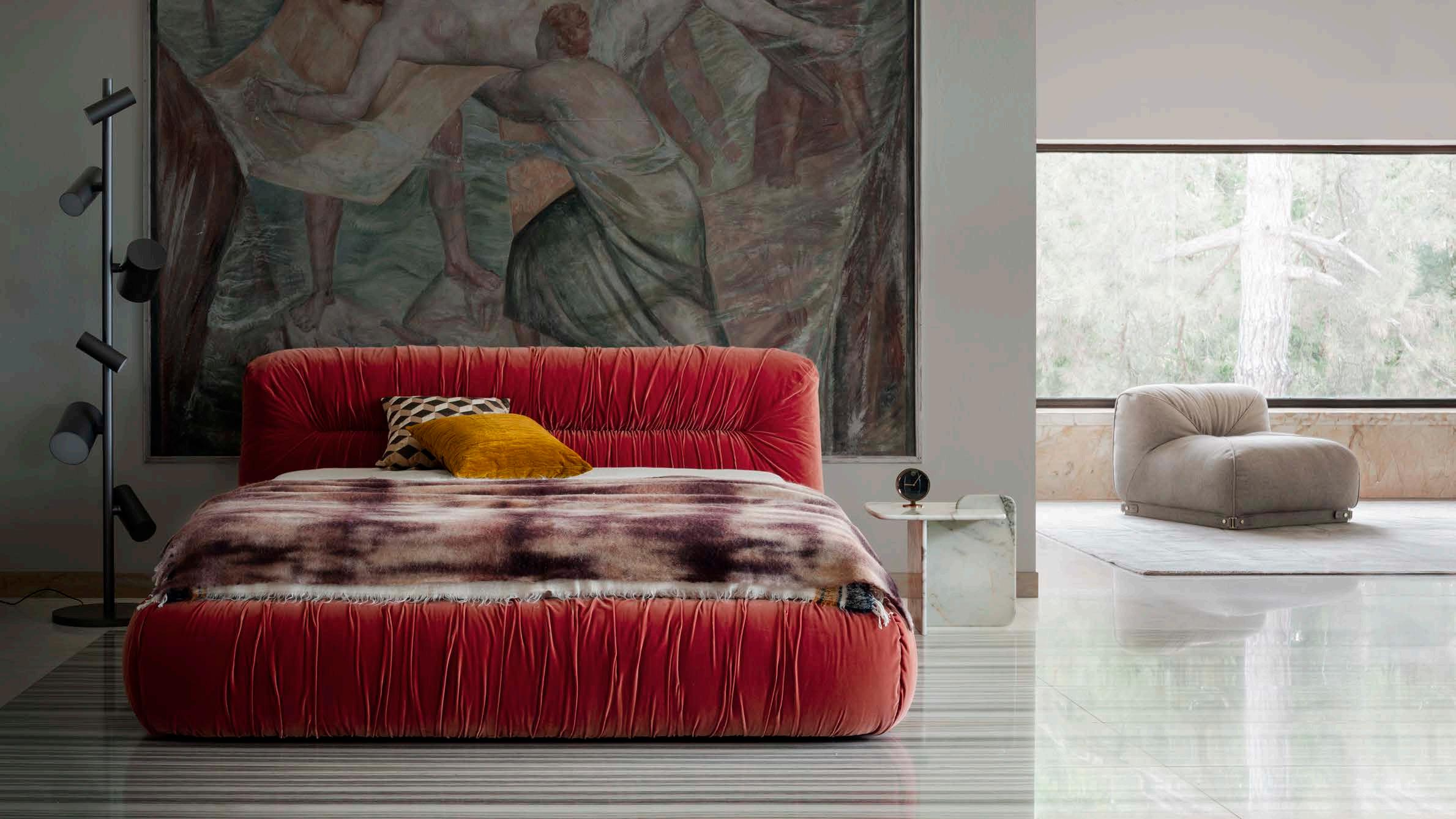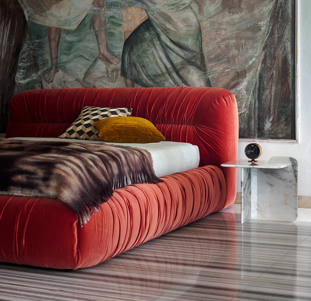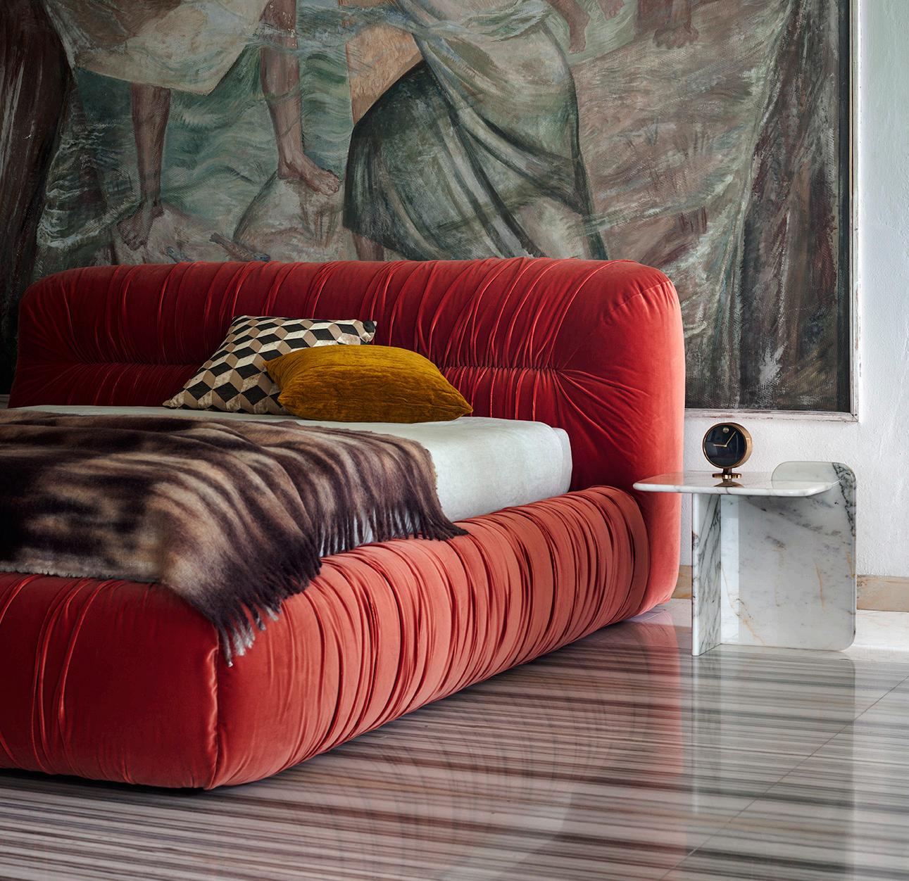 This bed is not simply a piece of furniture but a celebration of the movement, fluidity and expressiveness of the famous Caribbean dance. The sinuous shape allows the bed to unfold in the space in an elegant way, evoking the graceful and lively movements of mambo dancers. Each element of the sofa is composed in harmony with the others in a dance that invites you to lie down and let yourself be lulled by its comfort. The color of the chosen velvet recalls the energy and fertility of the tropical land, its generous curls the costumes of Creole dancers.