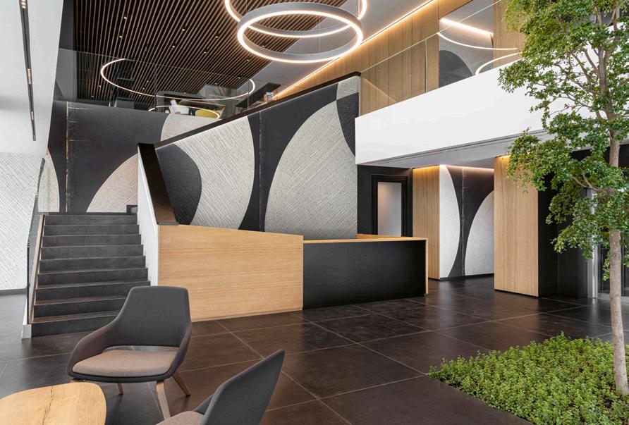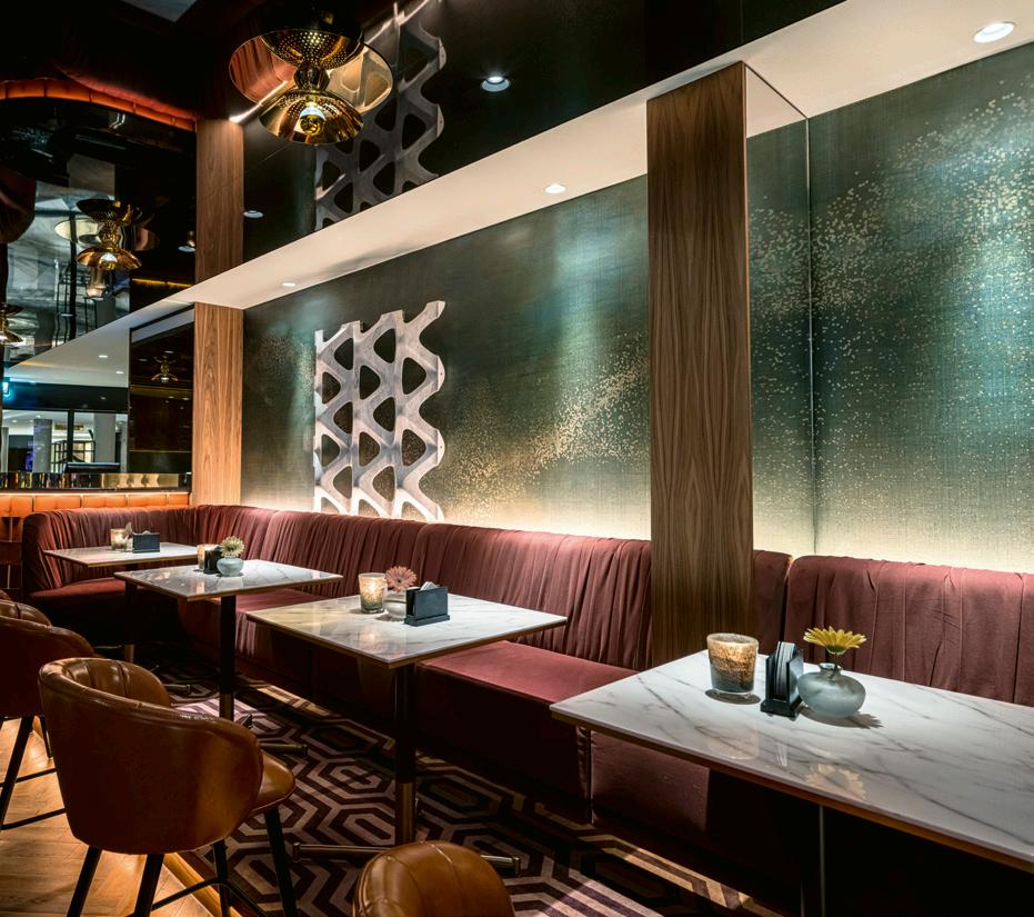 La zona de relajación de la planta baja se realzó con cálidos y acogedores paneles de madera, cortinas e iluminación tenue, y el revestimiento mural Soul. Con sus detalles concéntricos dorados, el tema recrea el efecto de un paseo por un bosque iluminado por los rayos del sol definiendo un ambiente íntimo y acogedor.
