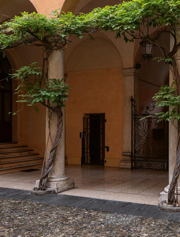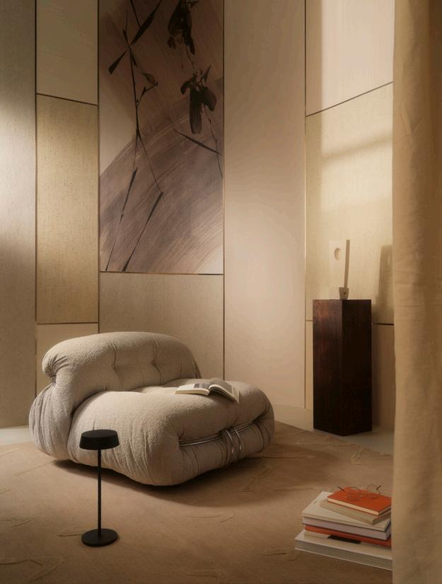 “La elección del sujeto Per Sempre de Glamora surgió de forma espontánea y empática”, explica la diseñadora Letizia Piani. “Me dejé llevar por su atmósfera atemporal, de estilo Art Déco, en su jardín un tanto tropical y mediterráneo, donde encontré el eco de una glicina centenaria que crece en el patio del edificio. Vi en ello un signo de continuidad, una conexión perfecta entre el interior y el exterior”.