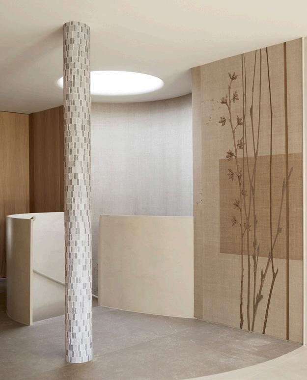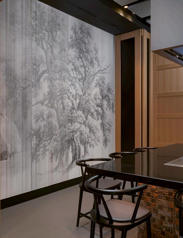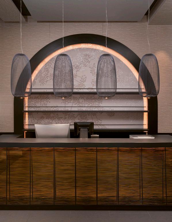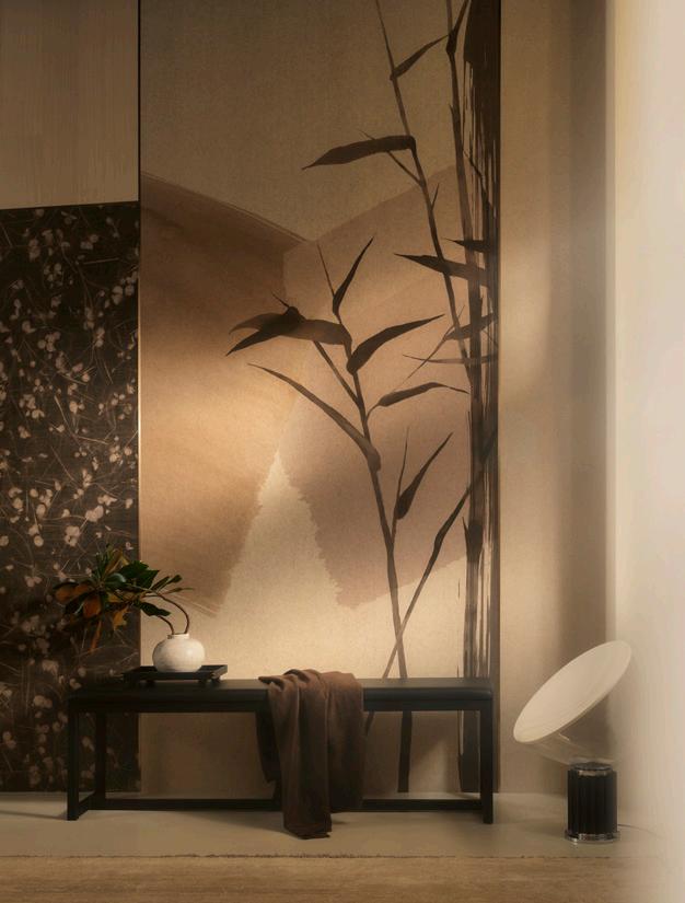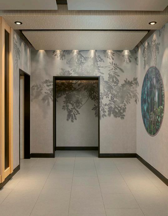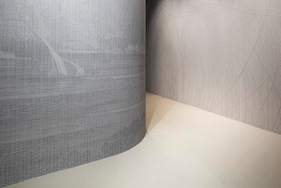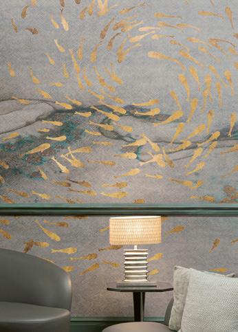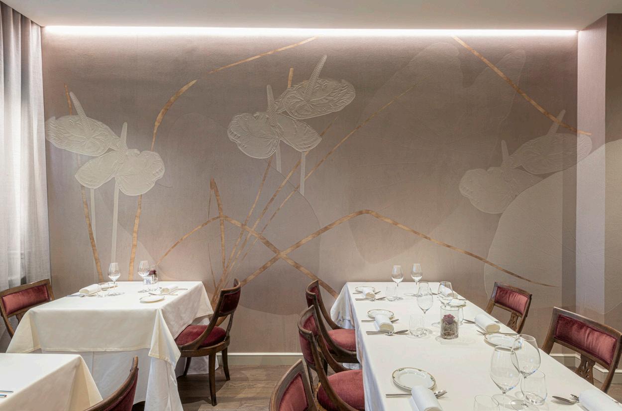 tacular vestíbulo, que da a los jardines exteriores con enormes ventanales arqueados y pavimentado con grandes losas alternas de mármol negro Marquina y mármol blanco de Carrara, se puede admirar el follaje agitado por el viento del revestimiento Dehors, en el techo, que parece acariciar suavemente toda la sala. Un ojo de buey con vistas a la vegetación del exterior (en referencia a la ya existente) y el ligero ramaje de Curiosity, se alternan en cambio con los patrones geométricos de Intreccio en los elegantes espacios del restaurante japonés, donde los colores y las texturas recuerdan a la cultura oriental. También se inspira en Oriente, Sinfonia, que define las paredes de la zona lounge con un ligero diseño de ramas florecidas junto a una estilizada linterna. En esta zona lounge se expresa la fuerza decorativa del revestimiento mural Flutti, en el que los vivos destellos de pequeños peces dorados destacan sobre diferentes tonos de gris.