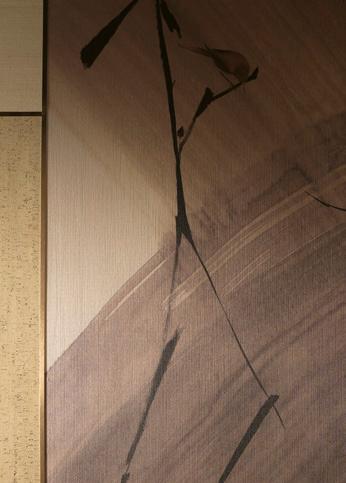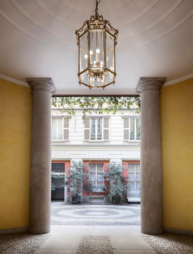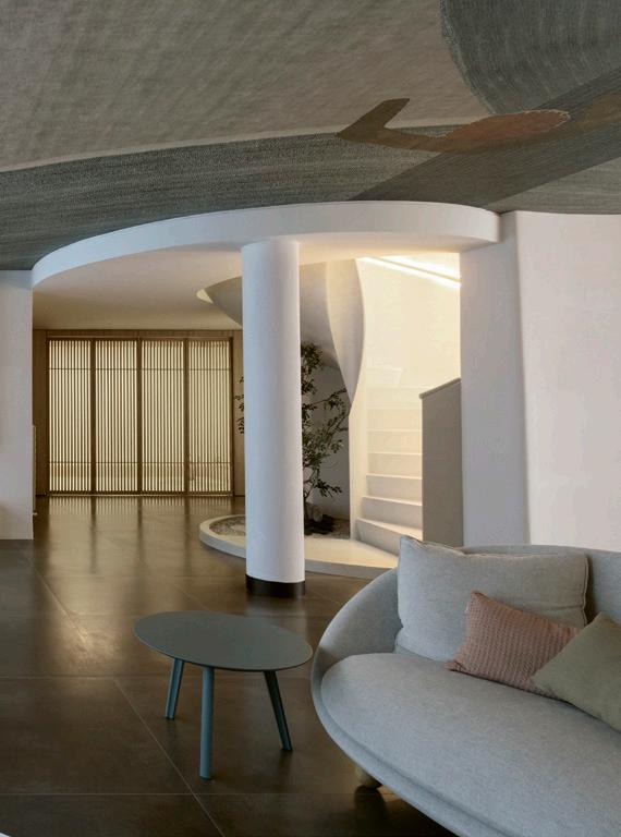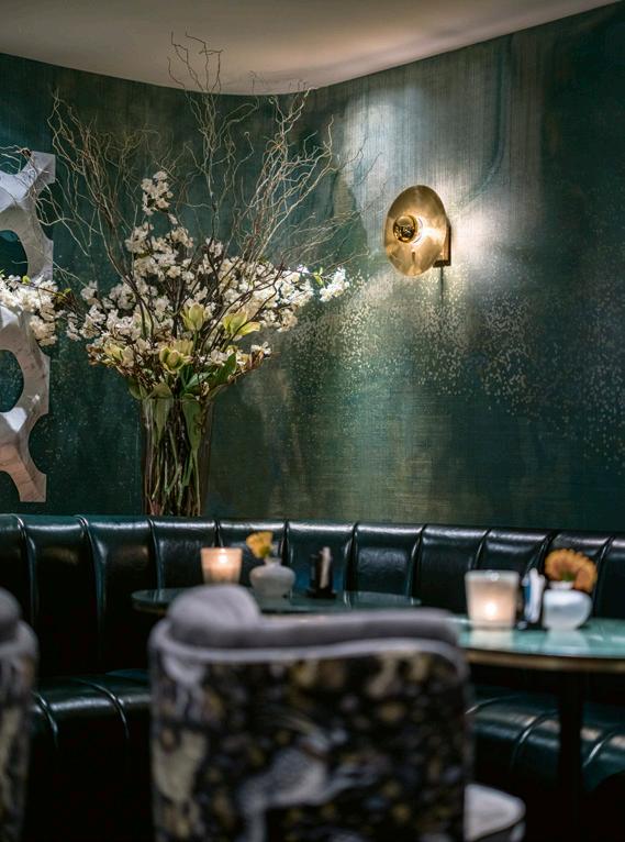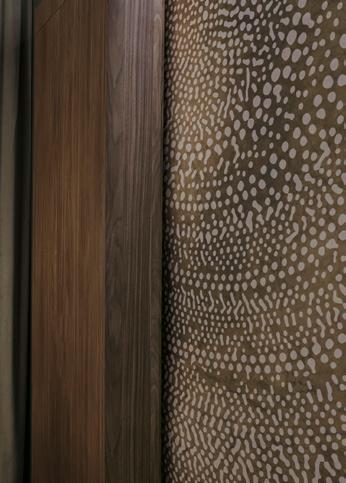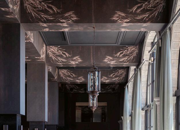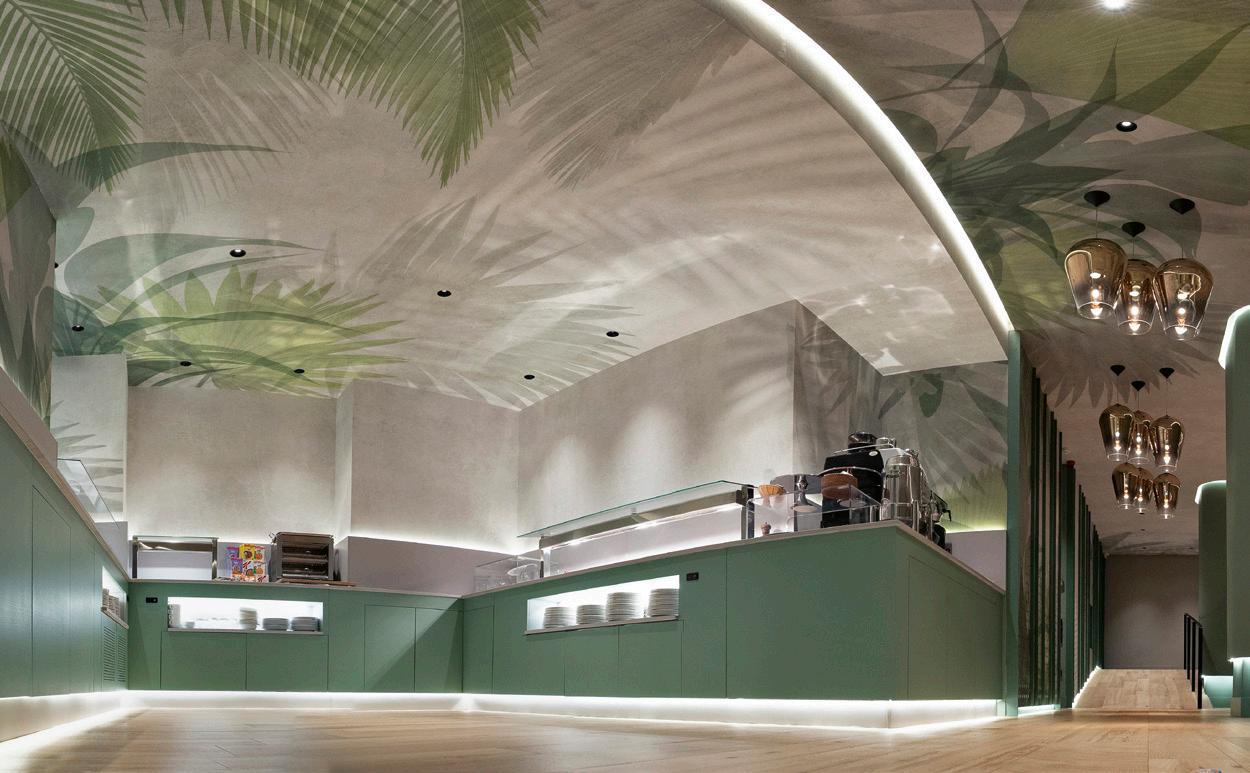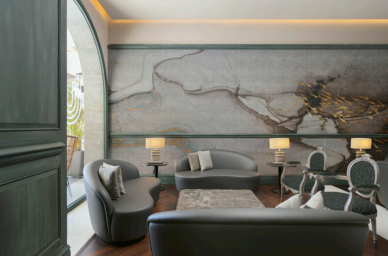 tacular vestíbulo, que da a los jardines exteriores con enormes ventanales arqueados y pavimentado con grandes losas alternas de mármol negro Marquina y mármol blanco de Carrara, se puede admirar el follaje agitado por el viento del revestimiento Dehors, en el techo, que parece acariciar suavemente toda la sala. Un ojo de buey con vistas a la vegetación del exterior (en referencia a la ya existente) y el ligero ramaje de Curiosity, se alternan en cambio con los patrones geométricos de Intreccio en los elegantes espacios del restaurante japonés, donde los colores y las texturas recuerdan a la cultura oriental. También se inspira en Oriente, Sinfonia, que define las paredes de la zona lounge con un ligero diseño de ramas florecidas junto a una estilizada linterna. En esta zona lounge se expresa la fuerza decorativa del revestimiento mural Flutti, en el que los vivos destellos de pequeños peces dorados destacan sobre diferentes tonos de gris.