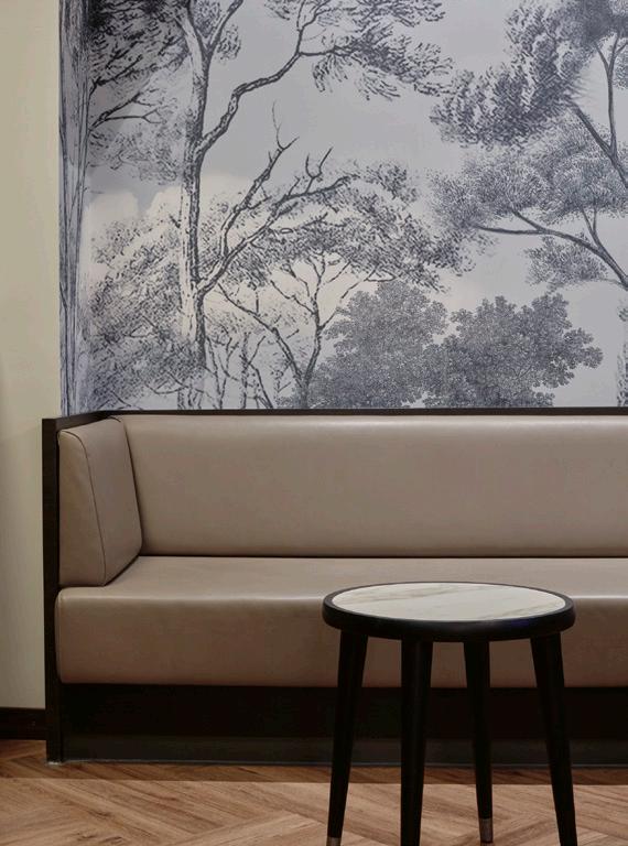 Gracias al sofisticado uso de los revestimientos murales y al servicio Glamora Bespoke, los diseñadores del estudio Boconni Projects consiguieron realzar la planta sótano del hotel convirtiéndola en un espacio inmerso en la naturaleza.