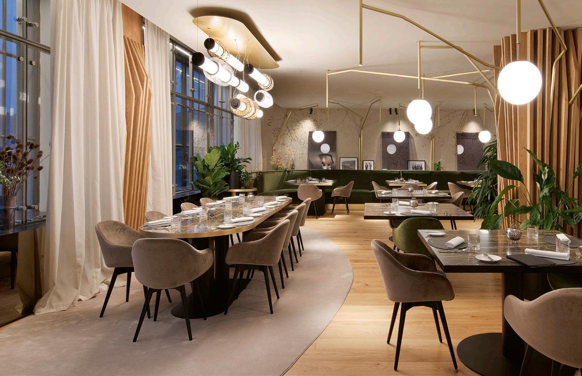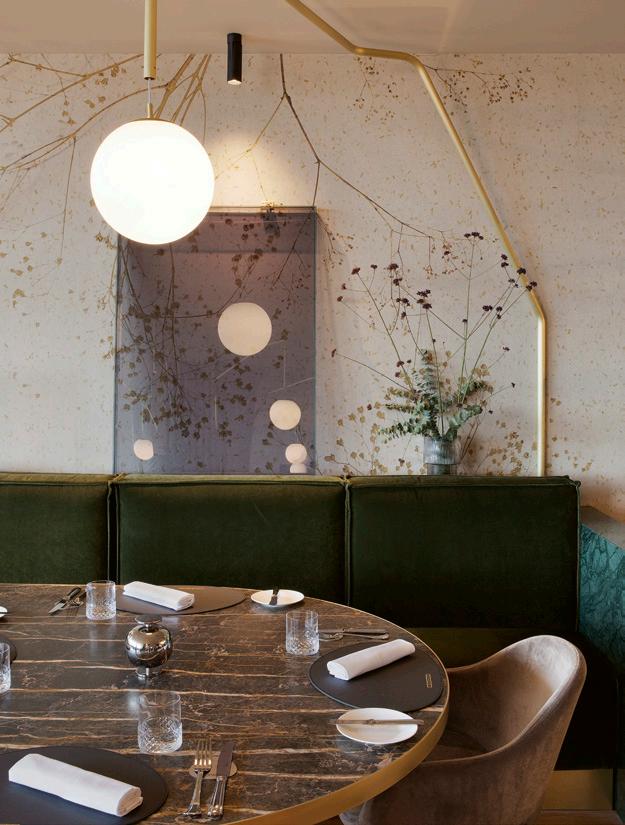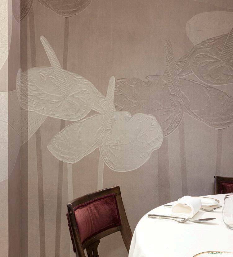 With its delicate references to the natural world, the selected wallcovering - Temps Perdu - played a crucial role in achieving design harmony, combining the desire for a relaxing feeling with that of creating a refined restaurant.