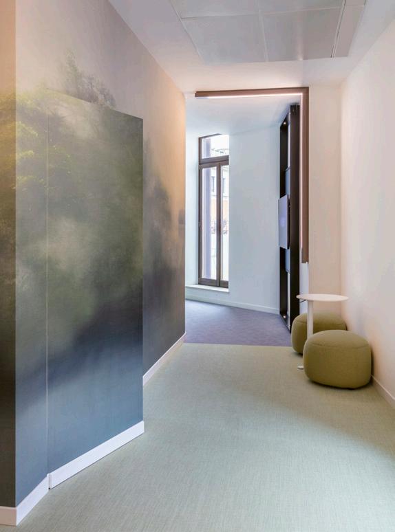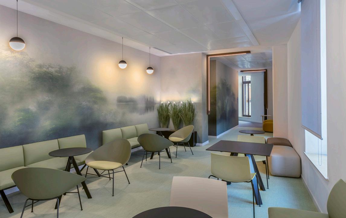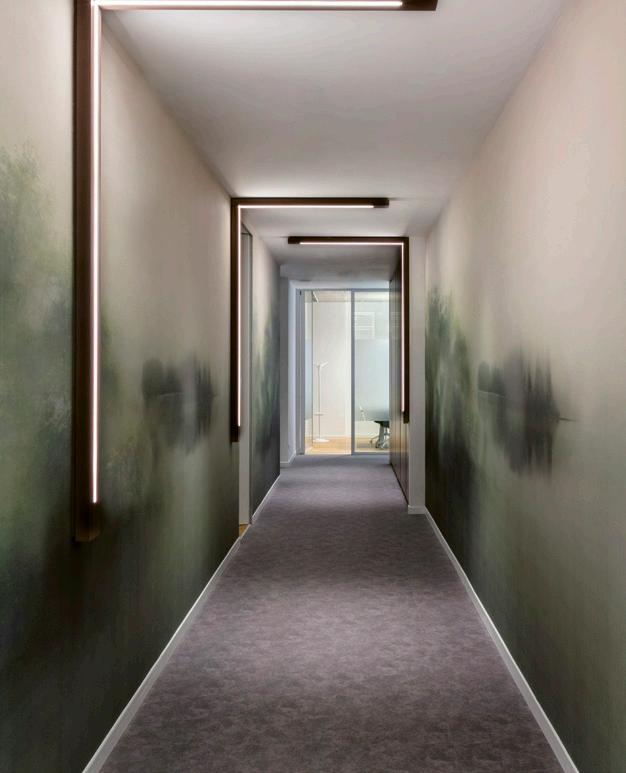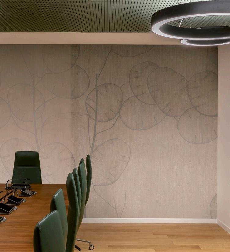En las distintas salas se utilizaron los motivos Matinée, Pure y Eterea en tonos tierra cálidos, recordando el travertino y la terracota, típicos de la «ciudad eterna». En las zonas de descanso y transición, el sujeto Matinée en tonos apagados de gris y verde subraya la importancia de la sostenibilidad para la empresa. El mobiliario y la iluminación están coordinados con los revestimientos murales, creando una armonía estética. En la sala de reuniones, la madera de la gran mesa central combina con el verde de los sillones tapizados y los tonos serenos de Eterea en la pared.