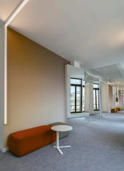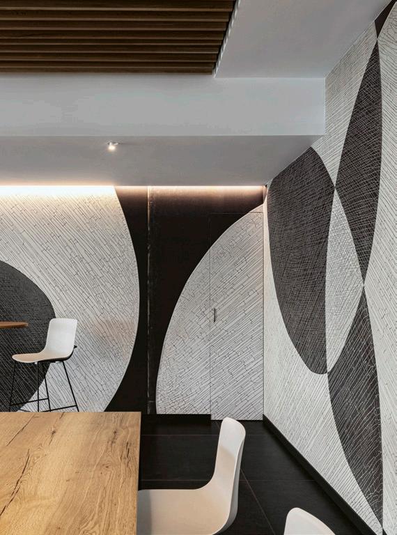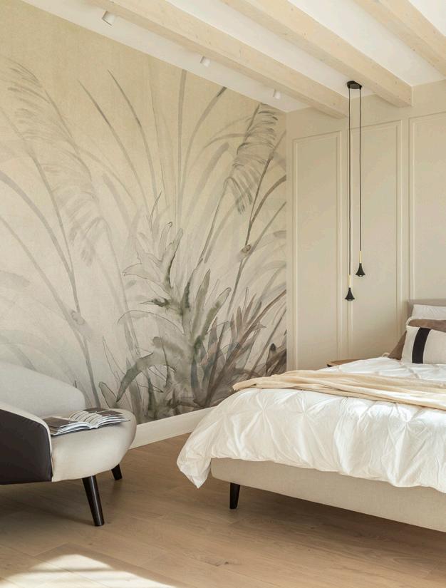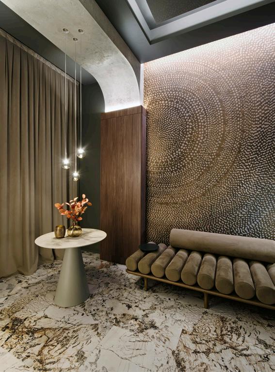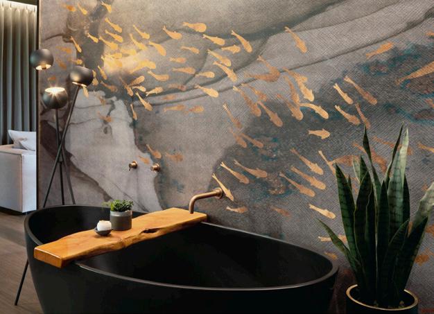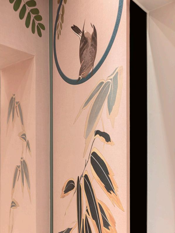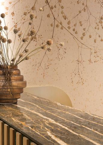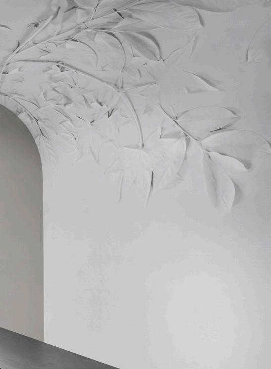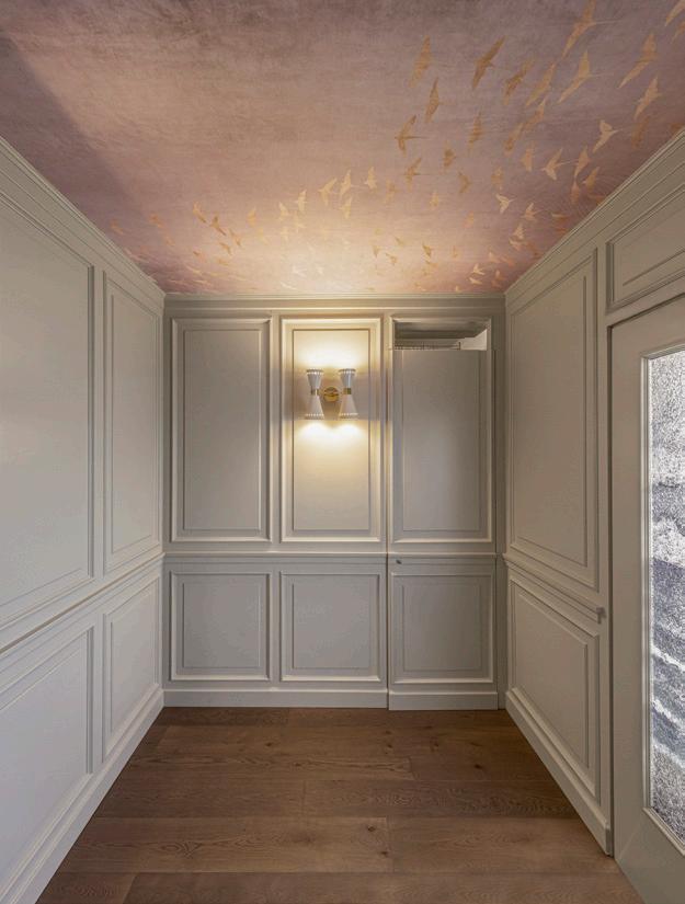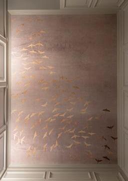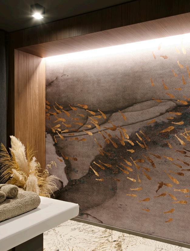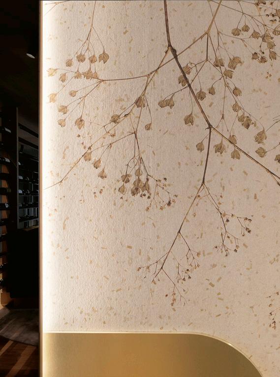 gedora, obtenida gracias a la combinación de la madera clara lacada de las boiseries con molduras de las paredes, el suelo de parqué y las lámparas de diseño. Los revestimientos murales Glamora, desplegados en dos dimensiones, amplían los espacios de manera ideal, otorgándoles una identidad específica. Al cruzar la entrada, caldeada por la boiserie que va del suelo al techo, la mirada se ve inmediatamente atraída por Aurea, un sujeto de la Creative Collection colocado en el techo, que, con sus golondrinas doradas, parece señalar el camino hacia la sala principal. Pasando al interior, toda la pared del fondo, revestida con el motivo de efecto sedoso Tamara de la Divina Collection en GlamSatin, proporciona un fresco y poético telón de fondo con un tema floral extragrande en cálidos tonos beige, gris y dorado. Una suerte de gran escenario natural que, gracias a la barra de luz incrustada en el techo, genera asombro desde cualquier ángulo que se mire.