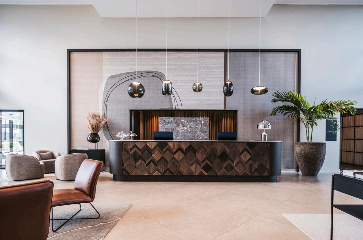 Al entrar, nos encontramos inmersos en exuberantes jardines tropicales, poblados de palmeras que ofrecen un oasis en medio de un paisaje de dunas que se extiende hasta el mar. Las habitaciones que se asoman a él, desde las zonas lounge hasta las suites, se hacen eco hábilmente de sus ritmos y colores. El diseño de interiores combina materiales nobles como diferentes tipos de madera, mármol y cerámica con revestimientos de última generación. Las propuestas de Glamora, escogidas de la Creative Collection, ofrecen una connotación incisiva a los ambientes más significativos. En el espec-