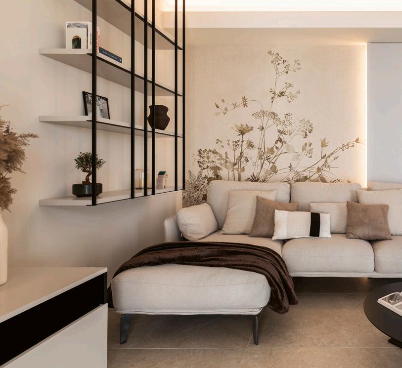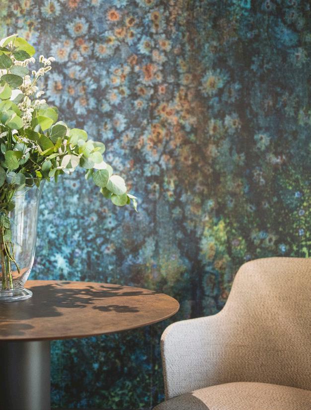 reza y la belleza de las acuarelas. Los tonos terrosos y los cuidados detalles de las flores y hojas del revestimiento Seika añaden un toque de elegancia y sofisticación al salón, contribuyendo a una experiencia visual y sensorial moderna pero conectada con la naturaleza.