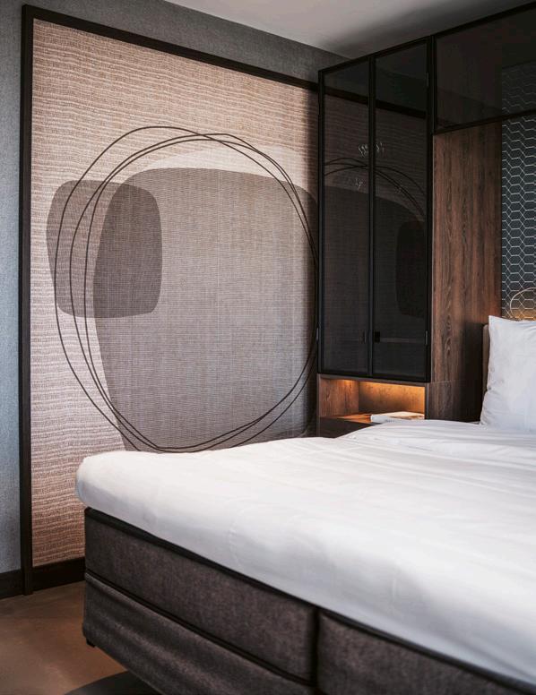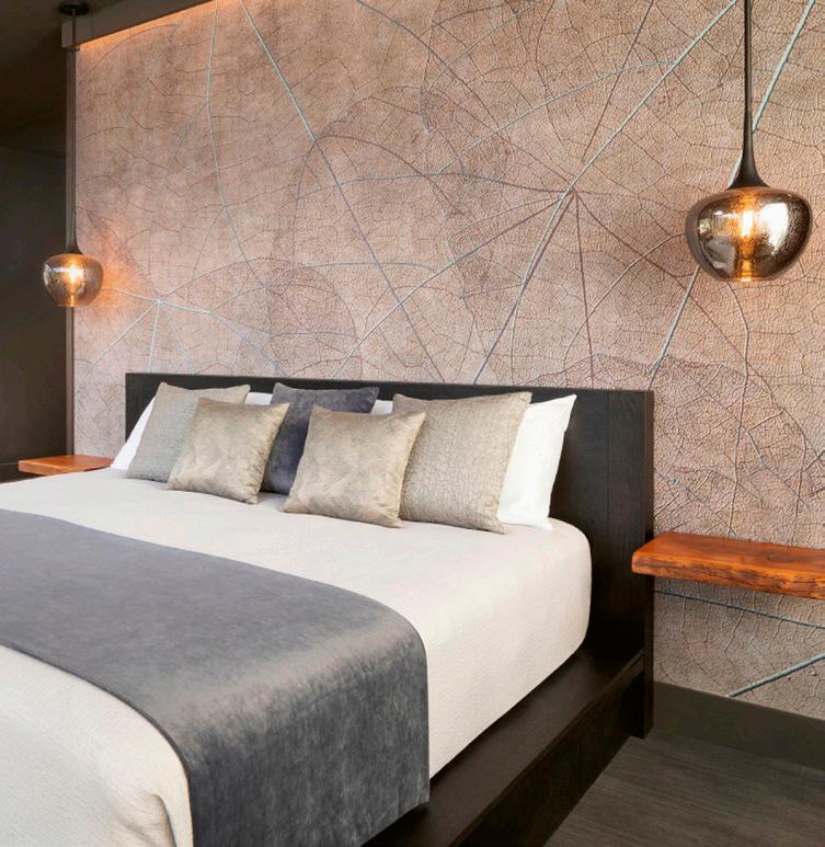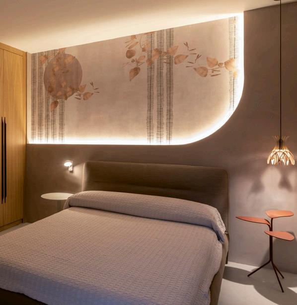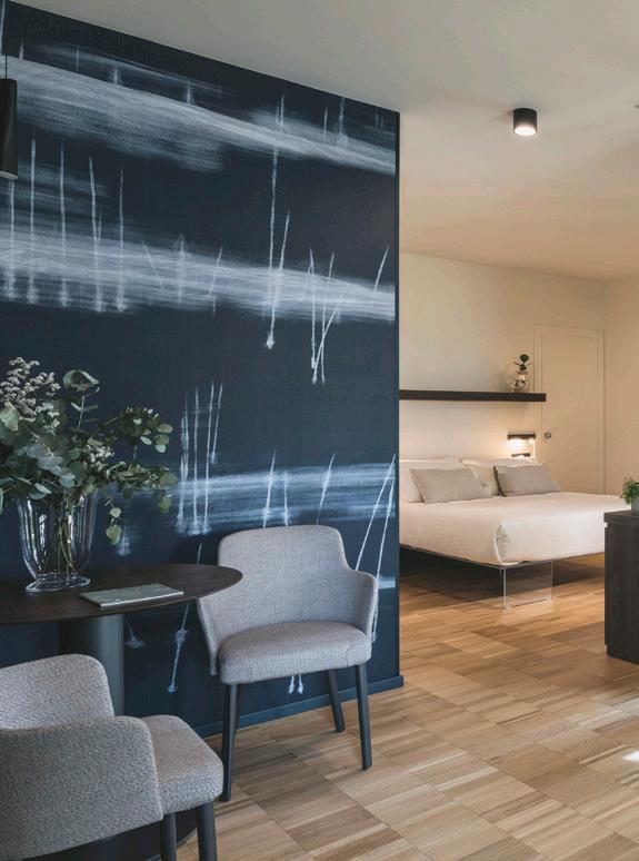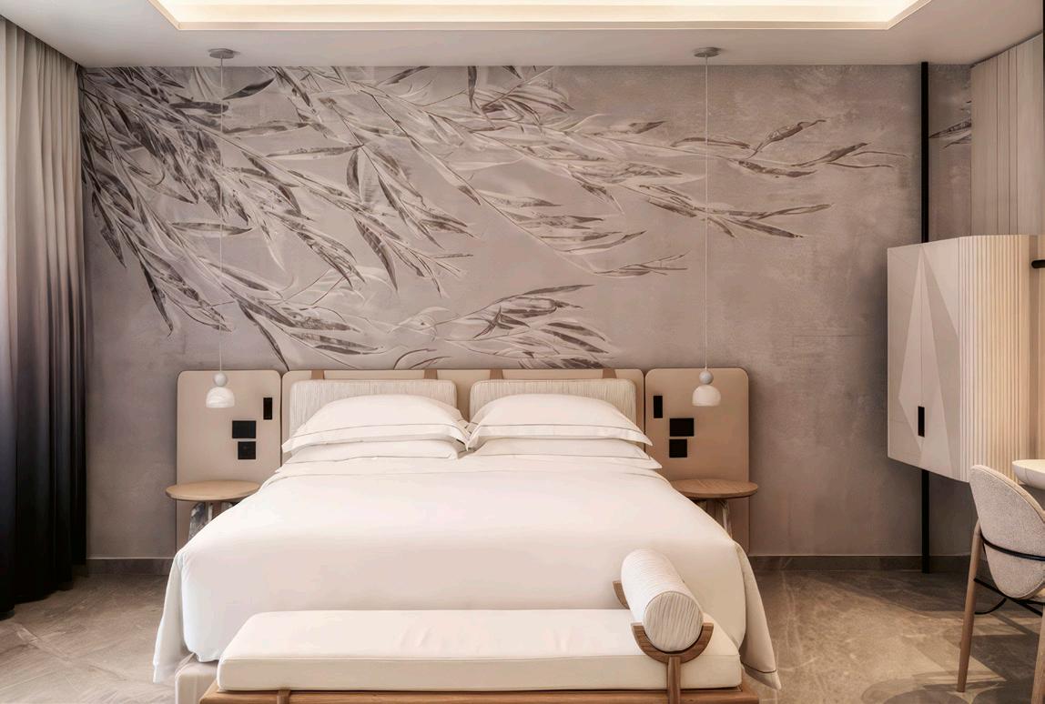 Presentes en varias de las habitaciones y suites del complejo, los revestimientos murales se funden armoniosamente con la refinada decoración minimalista, amplian-