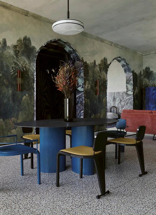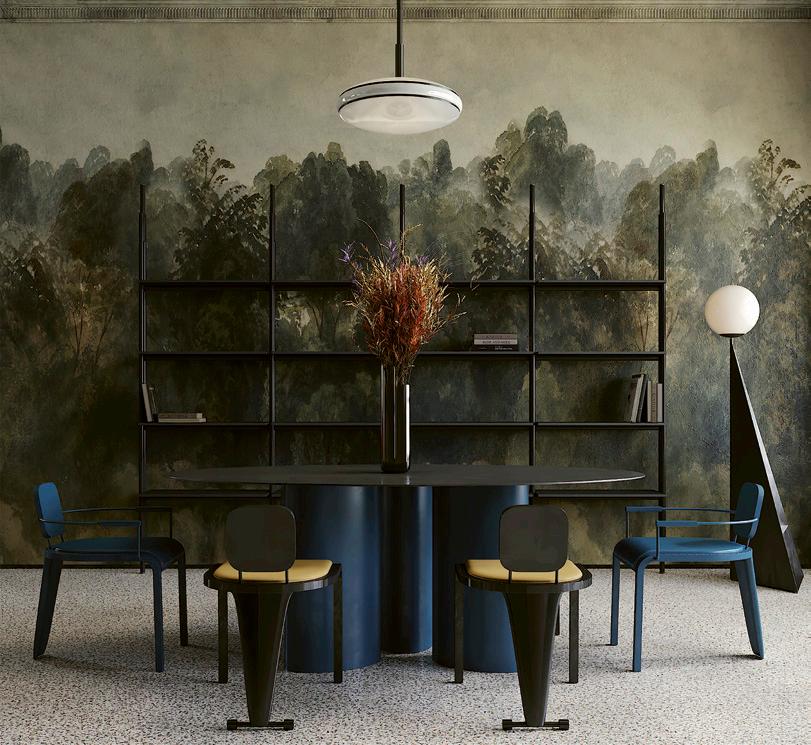 The Milanese appartment designed by Puntofilipino abandons contemporary minimalism for the Art Deco and Pop Art aesthetics of the Memphis Group, creating an immersive environment with heterogeneous materials, in which the landscaped views of the Bellagio wallcovering lend a dreamy atmosphere to the interior.