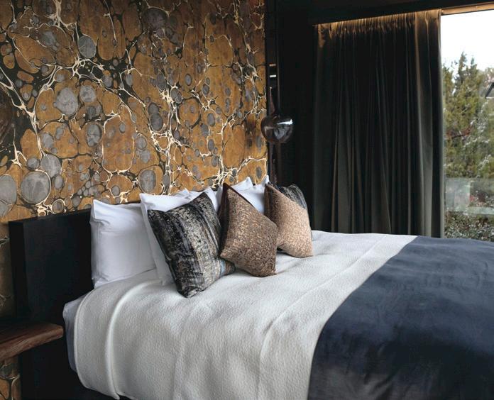 do la continuidad visual entre el interior y el exterior, abriendo la vista a terrazas privadas con piscinas y vistas panorámicas. Los revestimientos Sensation, Dehors, Sovas y Blur decoran las paredes detrás de las camas y en los espacios de estar, creando un ambiente sereno y sofisticado.