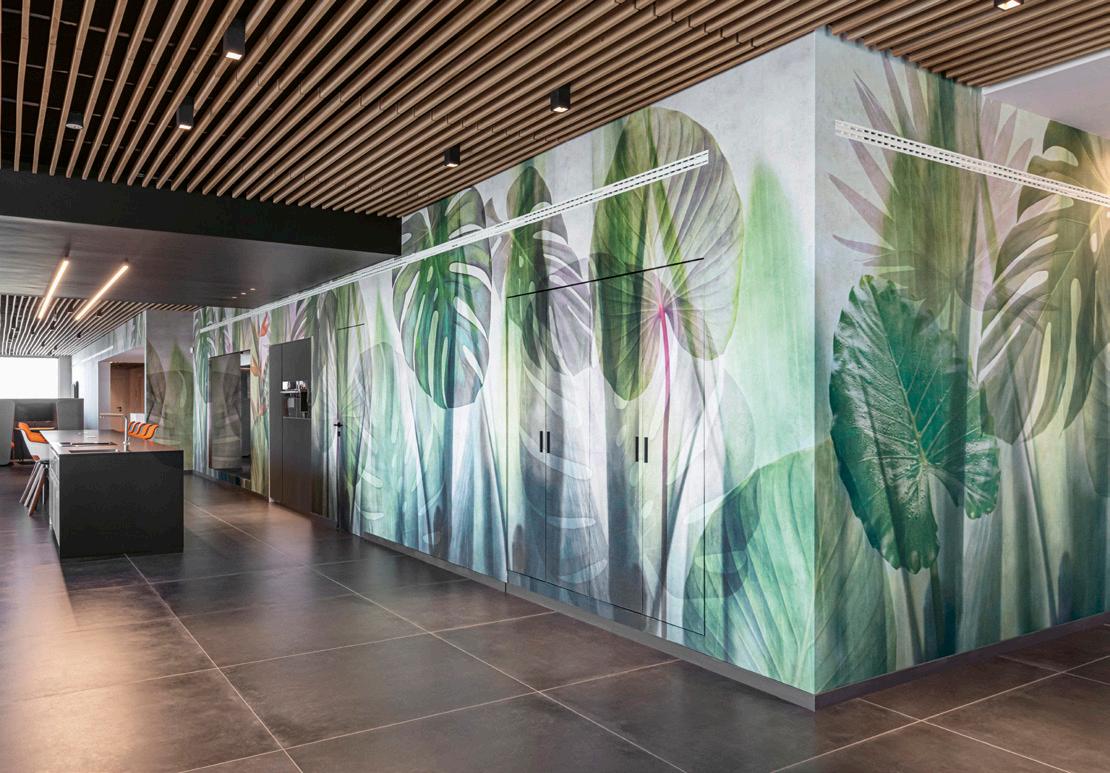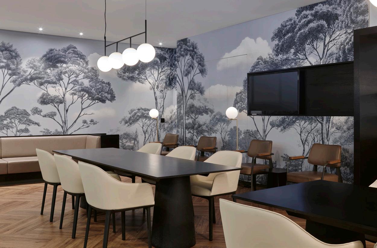 Aprovechando la versatilidad de los revestimientos murales Glamora y su capacidad para adaptarse a cualquier superficie, los arquitectos revistieron tanto las paredes cóncavas y convexas que conducen a la zona del bufé, como el techo, uniendo visualmente toda la sala y contribuyendo a crear un ambiente envolvente. En esta atmósfera sofisticada, las evanescentes hojas tropicales y la paleta cromática de verdes y grises armonizan perfectamente con el resto de la sala.