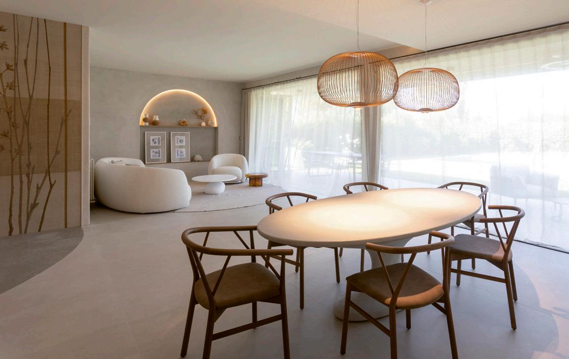 La combinación de diferentes superficies materiales -como parqué de roble, gres porcelánico efecto piedra caliza y mármol, revestimientos murales de fibras naturales y muebles a medida- contribuyó a crear un ambiente acogedor y refinado que evoca espacios inspirados en la naturaleza.