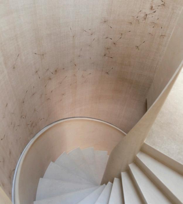 The application of Komorebi Collection’s Moribana wallcovering on GlamPure, an organic and sustainable material, is the focus of this project. This nonwoven fabric, consisting of pure European linen and viscose, not only offers a highly aesthetic finish, but also ensures a sustainable ecological impact. The staircase surfaces, covered by Moribana, feature delicate patterns that evoke an intimate connection with nature, creating a serene and cosy atmosphere within the living spaces. Another distinctive element of the project is the Mimas wallcovering from Creative Collection. This bold choice not only adds an unexpected and dynamic dimension to the interior, but also underlines the versatility of the materials used. Mimas, with its enveloping design, transforms the ceiling into a focal point, adding depth and movement to the room. Its sophisticated texture creates a striking visual effect that plays with natural and artificial light, enhancing the perception of space.