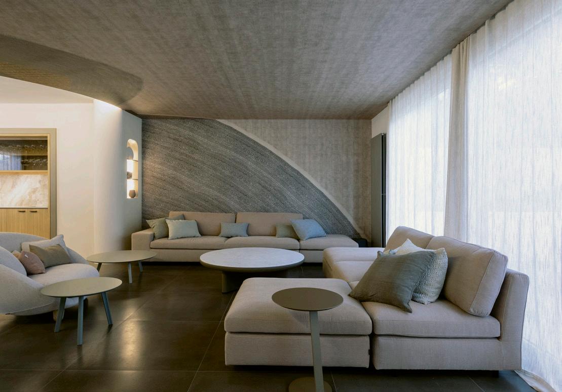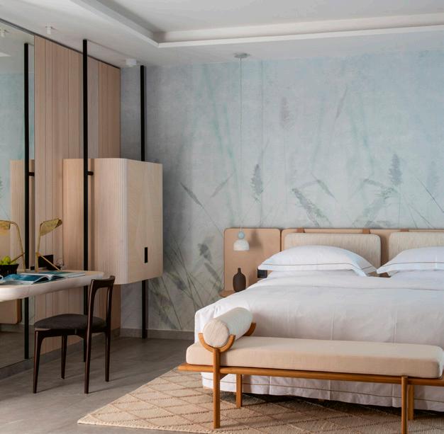 Gracias a una paleta de colores suaves, uno se ve envuelto en una inmediata sensación de familiaridad, donde la fresca brisa marina se mezcla con una cálida bienvenida. Las habitaciones están adornadas con detalles selectos: tejidos suaves, refinados revestimientos murales, esencias de madera y mármol refinado, que confieren al interior una atmósfera de tranquila elegancia. Incluso en las habitaciones, los revestimientos murales elegidos se realzaron como grandes lienzos, ofreciendo no sólo un acento decorativo sino también practicidad y durabilidad, características esenciales en un entorno contract de alto tráfico.