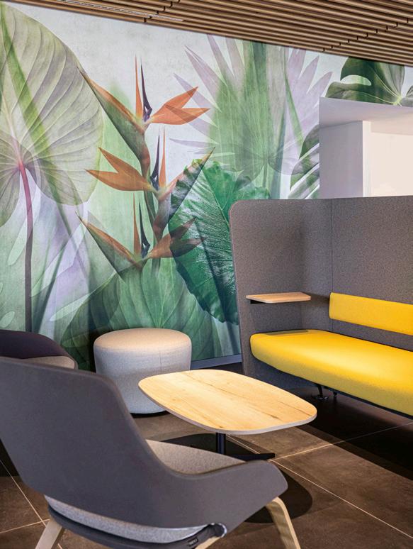 La principal aspiración era crear la ilusión de un jardín interior integrando elementos vegetales en un entorno cerrado y carente de luz natural. Para lograrlo, Boconni Projects optó por el revestimiento mural Exotic, un diseño moderno que transporta a los huéspedes a un exuberante jardín tropical.
