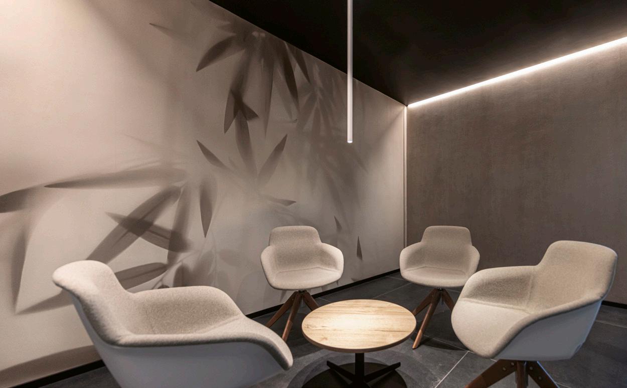 En la sala dedicada a las conversaciones más confidenciales, como las entrevistas, se utilizó Desire sobre AcousticShield, un sistema de revestimiento mural bicapa que optimiza el bienestar acústico interior creando una barrera fonoabsorbente donde los participantes pueden aislarse y sentirse a gusto, gracias también a la suave iluminación que crea un ambiente muy relajante.