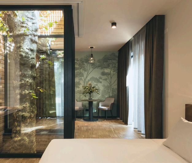 árboles del parque no son sólo elementos decorativos, sino elementos centrales de las suites, realzados por grandes ventanales que ofrecen vistas privilegiadas de la vegetación circundante y fomentan una integración visual continua con el paisaje.