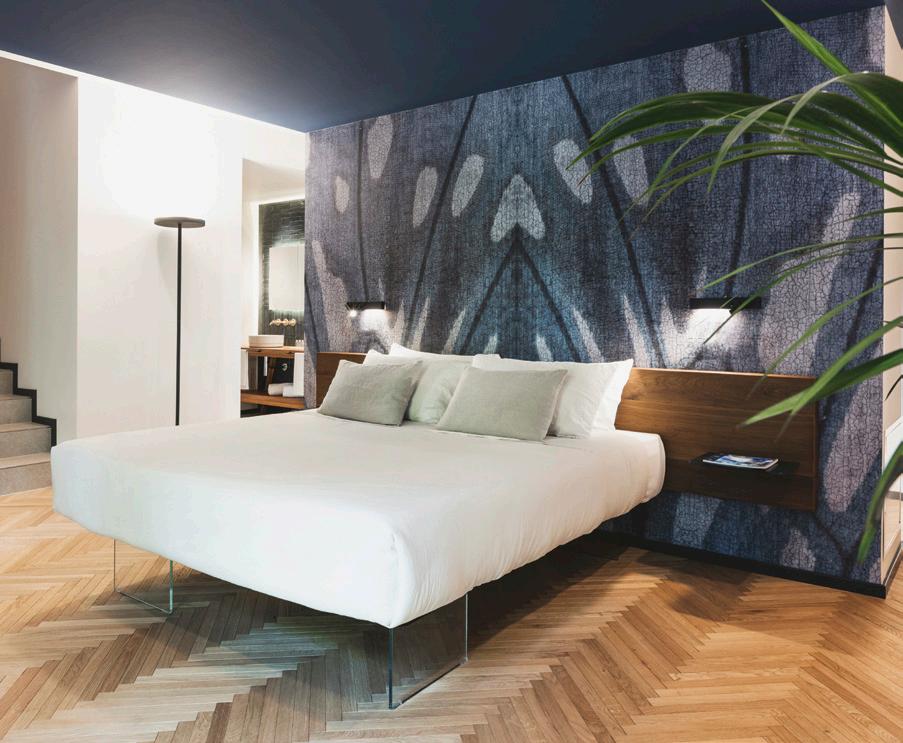 The choice of Glamora wallcoverings was crucial. The selected collections express discreet elegance and remarkable matericity, the guidelines of the concept. The wallcoverings became the focal point of all spaces, seamlessly integrated even on the flush doors. Illuminated by daylight, with naturalistic subjects and subdued colours, they convey a sense of peace and mental comfort.