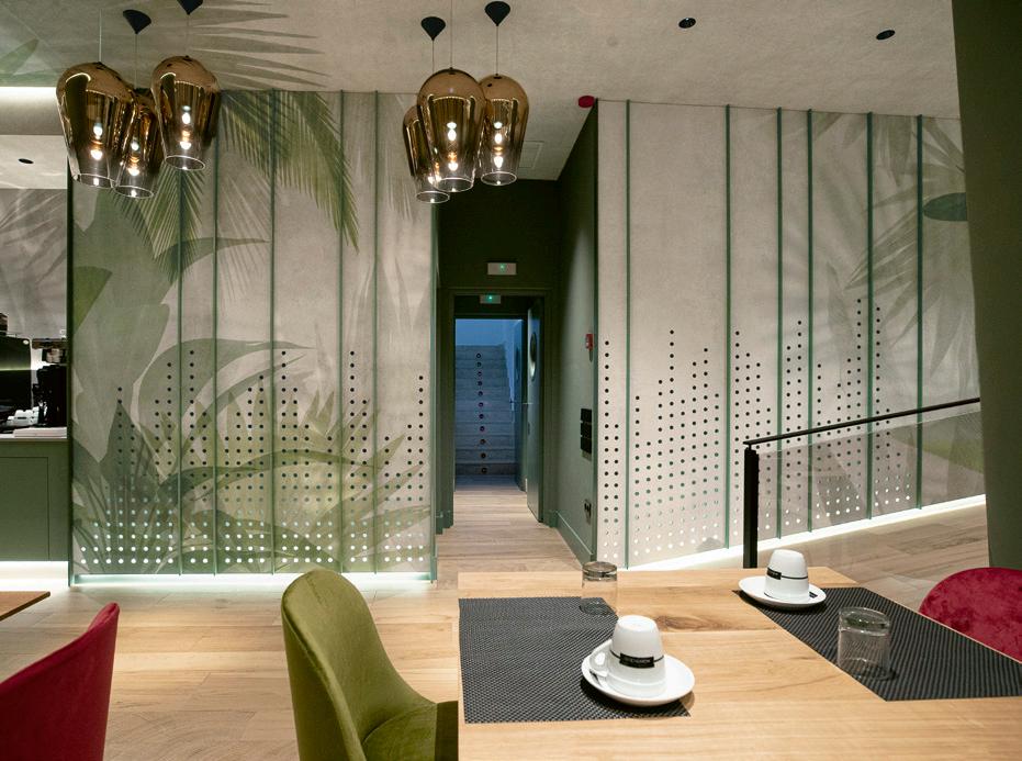 Con diferentes temas de gran personalidad, como los revestimientos murales Ego y Equatorial Jungle, los arquitectos han dado una impronta visual identificable, insertando toques de color que ofrecen agradables sensaciones de respiro a las operaciones cotidianas. Además, el estudio de diseño optó por optimizar realmente la calidad del aire ambiente, utilizando la última tecnología de vanguardia desarrollada por Glamora. En efecto, la eco-resina con acción ionizante Ecopur® de Oltremateria® es un revestimiento protector que, aplicado a los revestimientos murales, purifica y mejora el aire, ayudando a prevenir la proliferación bacteriana y vírica.