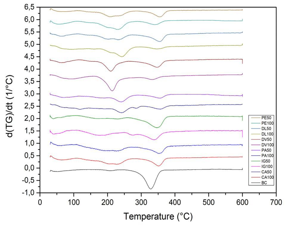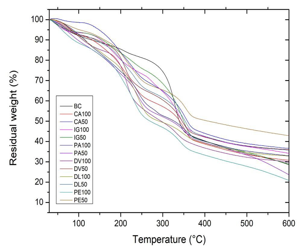 Lower lignin contents acted as nucleating agents, increasing crystallinity, but high contents restricted the organization of the PBAT polymer chains, resulting in a reduction in total crystallinity[17]. The peak height was not directly proportional to the addition of urchin.