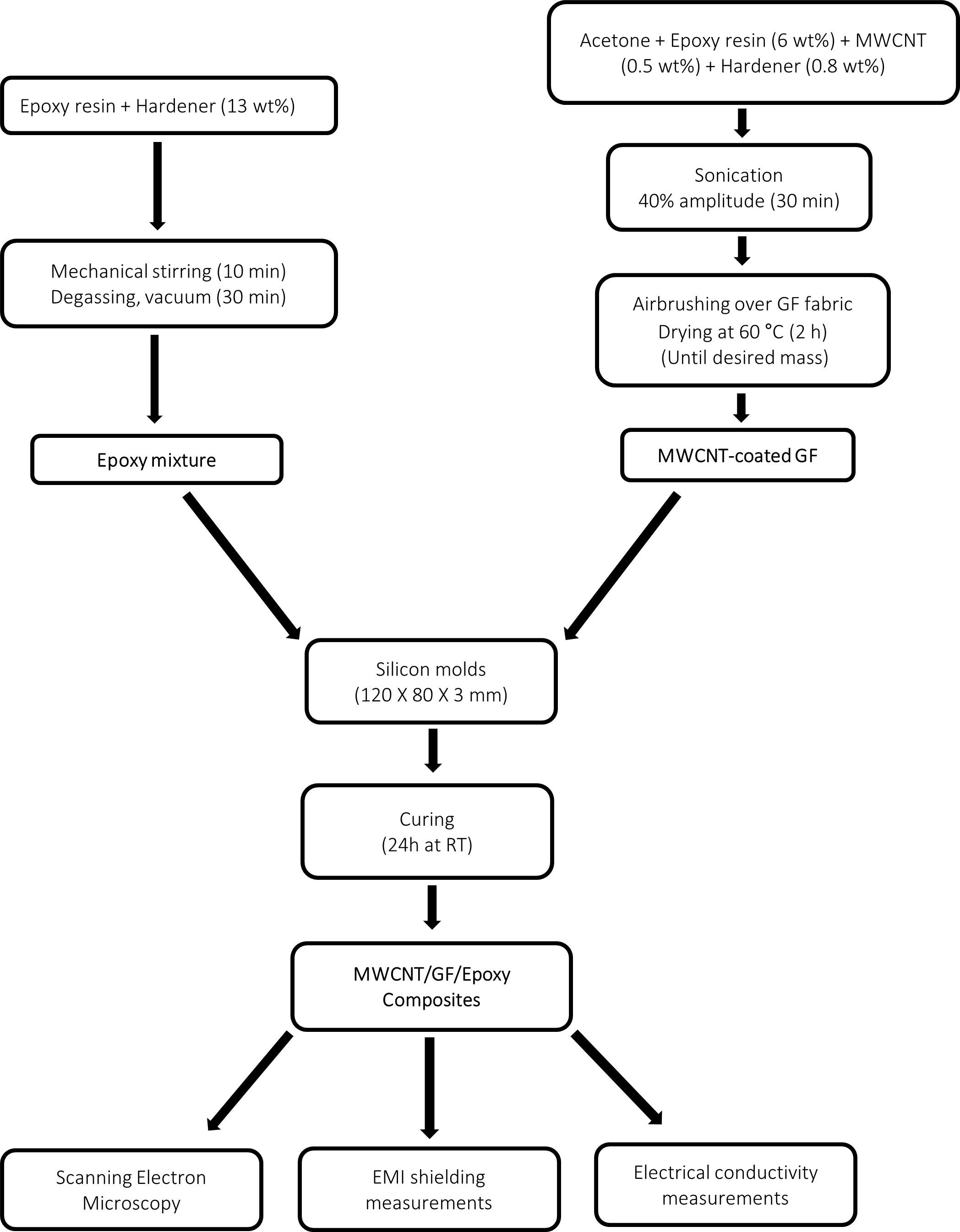 The results show that the airbrushing method has proved to be a promising option as a route to deposit carbon nanotubes on glass fiber fabrics, to obtain thin and light composites. Evaluations of reflectance, absorbance and effective absorbance showed a reflective value higher than effective absorbance, suggesting that the reflection mechanism was dominant in MWCNT/GF/epoxy composites. EMI shielding