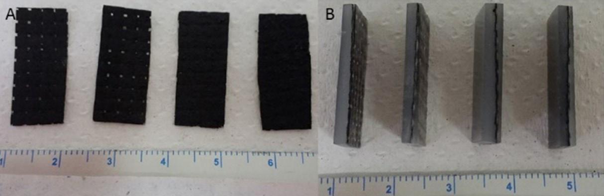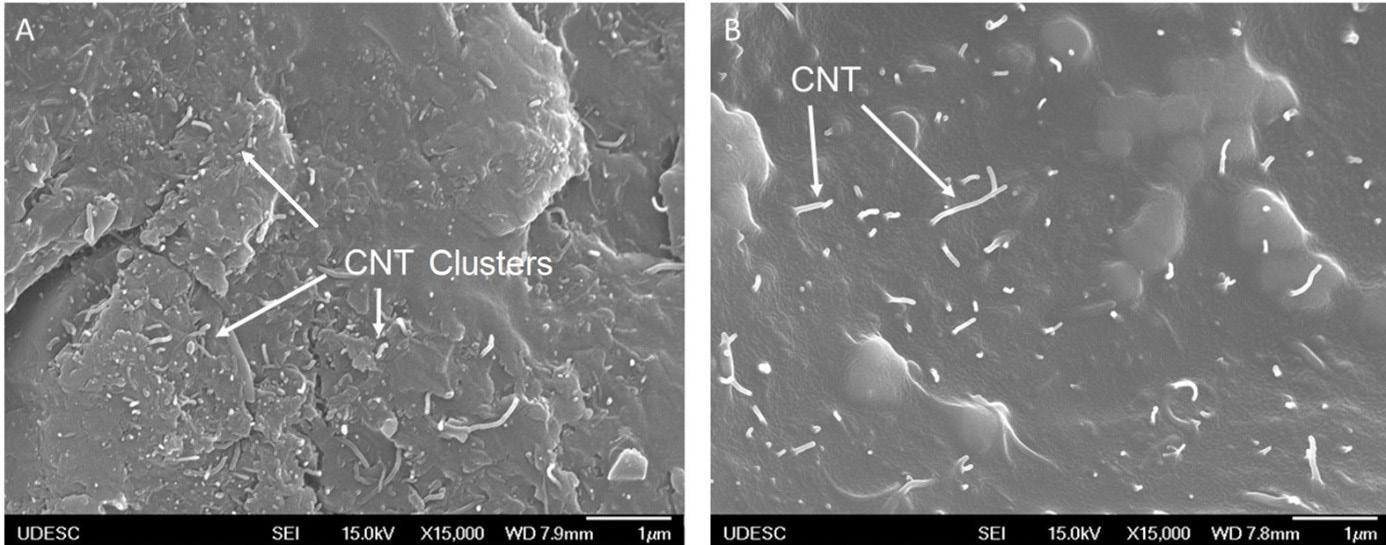 Table 1 shows the electrical conductivities of MWCNT/ GF/epoxy nanocomposites measured by 4-point probe method. The conductivity values of 6.7x10-6 and 1.2x10-3 S/cm for the samples with 2.7% and 3.4% of deposited MWCNT, respectively, evidence the formation of a conductive path (percolation) network for higher MWCNT concentrations.