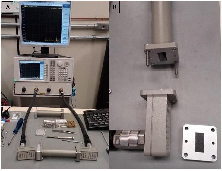 Figure 3. Pictures of A) Vector Network Analyzer for SE measurements; B) Sample holder.