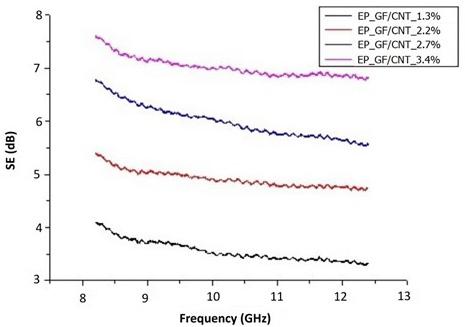 Shielding effectiveness was increased in MWCNT/ GF/epoxy nanocomposites due to addition of epoxy resin (Figure 7). The best results were obtained for nanocomposites containing 3.4% MWCNT, with the attenuation of 83% of incident EW, which means 7.6 dB of EMI shielding effectiveness.
