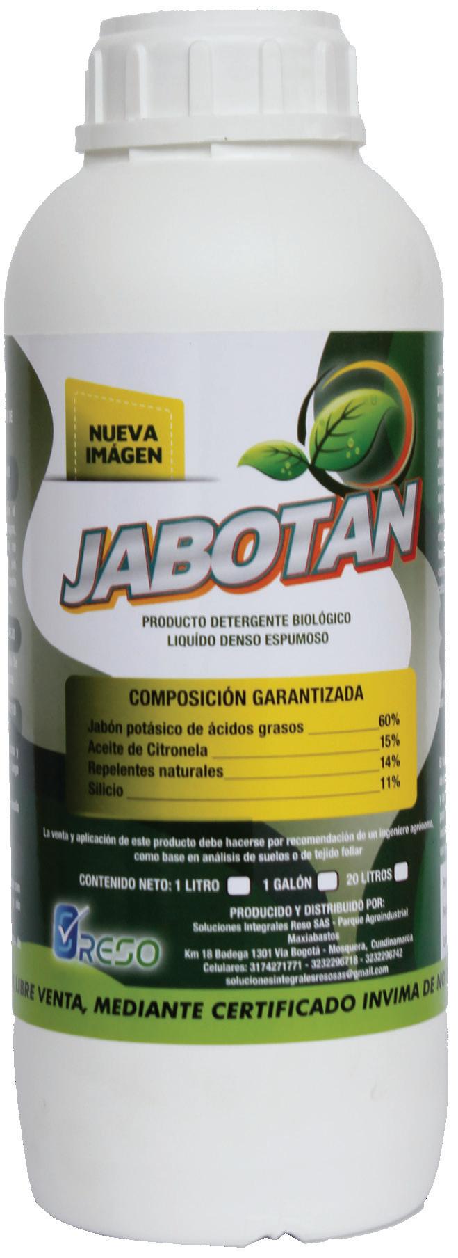 JABOTAN, es un jabón potásico natural con aceite de citronela, formulado para actuar como un insecticida y fungicida efectivo en el control de plagas y enfermedades en los cultivos. A diferencia de los jabones tradicionales, JABOTAN no contiene sodio, lo que lo convierte en una opción más suave y respetuosa con el medio ambiente. Este producto es biodegradable y no deja residuos tóxicos, por lo que es seguro para su uso en personas, animales, y en los propios cultivos.