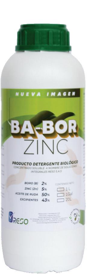 BA-BOR-ZINC, es un jabón en base de boro, zinc, aceite de ruda formulado a partir de ácidos grasos, dipentenos, tensoactivos y surfactantes de origen natural que dan lugar a un producto bioracional ambientalmente amigable y libre de sustancias perjudiciales como sodio, fenoles y óxido de etileno.