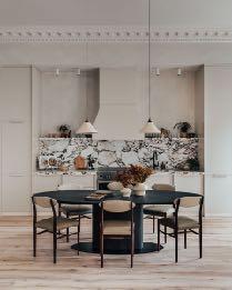 Named after the annual May Fair, historically held in Shepherd Market, Mayfair has long been synonymous with celebration and prestige - while Shepherd Market itself retains a distinctive bohemian charm. Just steps away, within 36 & 37 Hertford Street Residences, the apartment designed by A.LONDON draws inspiration from the neighbourhood’s signature blend of understated luxury and cosmopolitan flair, with interiors that showcase soft textures and a serene, tonal palette. In the main living area, a bespoke velvet roll-arm sofa upholstered in Turnell & Gigon fabric sits beneath antique wall sconces, infusing the space with a sense of heritage. The adjoining open-plan kitchen and dining area is anchored by Italian marble and ceramic pendant lights, complete with antique brass fittings and brown woven cable - a subtle nod to the traditional creamware found in French farmhouses.