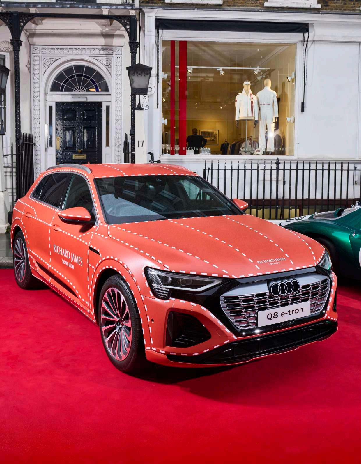 The Q8 e-tron is wrapped in an appropriately electrifying orange ‚suit’, fashion’s colour of the season, while trying it in with the iconic Richard James papaya summer fresco double-breasted Hepworth.